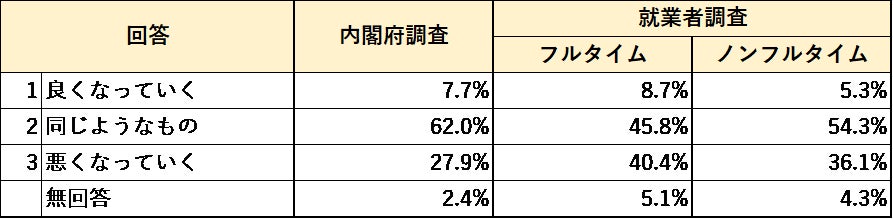 今後の生活の見通しについては、就業者調査の方が「悪くなっていく」とする割合が高く、特にフルタイム就業者でその傾向が顕著。就業者調査の方が内閣府調査に比べて現役世代の割合が高いため、景気も含めた先行きに不安を感じていることが伺える。