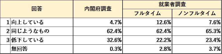 現在の生活への満足度は、内閣府調査と就業者調査でほぼ同じ傾向。去年と比べて生活が向上しているかを聞いたところ、高齢者の割合が多い内閣府調査よりも就業者調査の方が、フルタイム・ノンフルタイムともに「向上している」が多かった。就業する中でコロナ禍からの景気回復を実感している人が多いことが推察される。