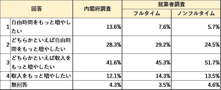 一方で、収入と自由時間のあり方について聞いたところ、フルタイム就業者は「自由時間をもっと増やしたい」、ノンフルタイム就業者は「収入をもっと増やしたい」とする傾向が高かった。
