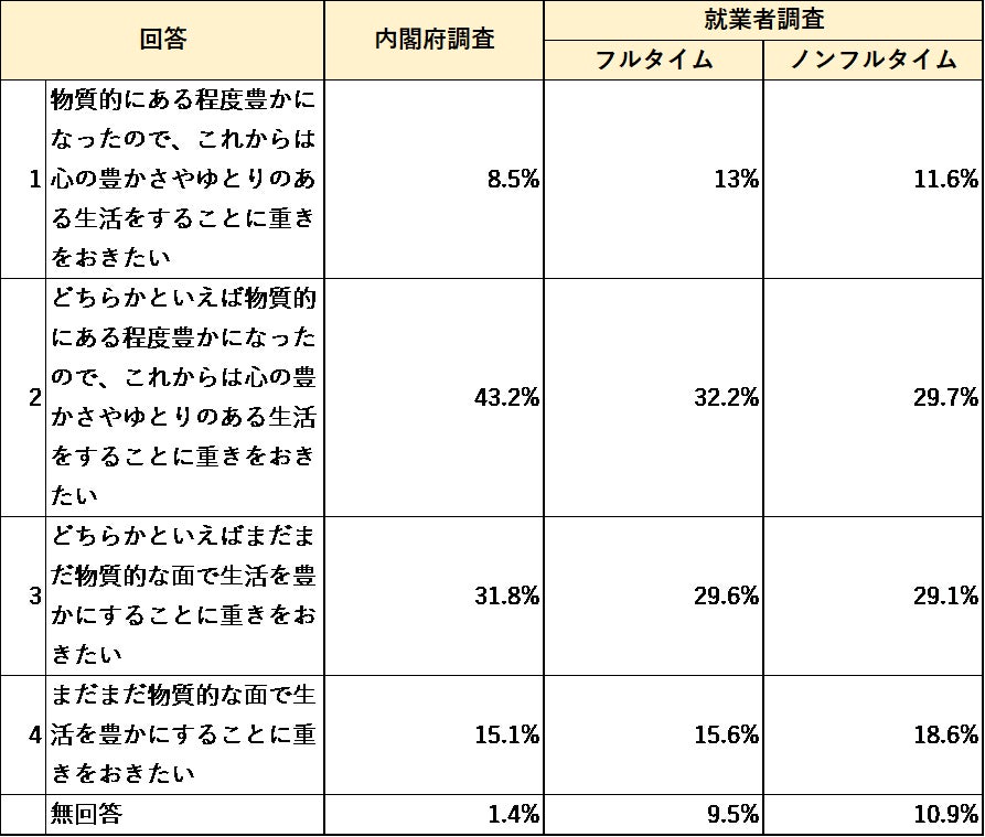 心の豊かさと物の豊かさの優先順位については、比較的高齢者の割合が高く就業者以外も含まれる内閣府調査の方が、心の豊かさを重視する割合が高い。