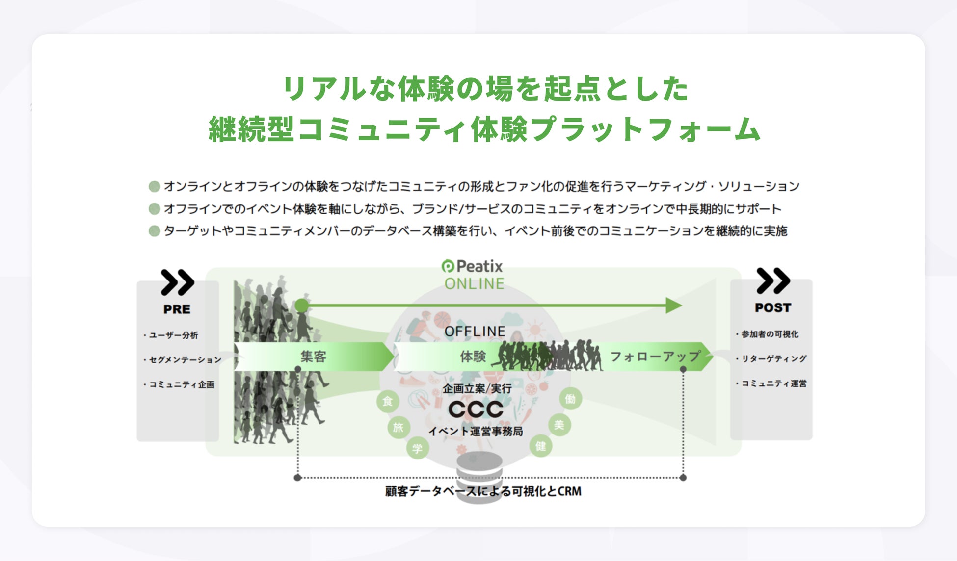ピーティックスとCCCは、業務提携を通じて、CCCが顧客エンゲージメントを高めるためのイベント企画・運営を行い、ピーティックスのプラットフォームで企業とコミュニティメンバー間の双方向のコミュニケーションを活発化させることで、サービス・製品への理解と愛着を深めます。また、CCCが有するデータベースマーケティングの知見をもとに、イベント参加前の潜在顧客へのアプローチや参加後のフォローアップの全体設計を行い、コミュニティの発展によるビジネスの成長に貢献いたします。