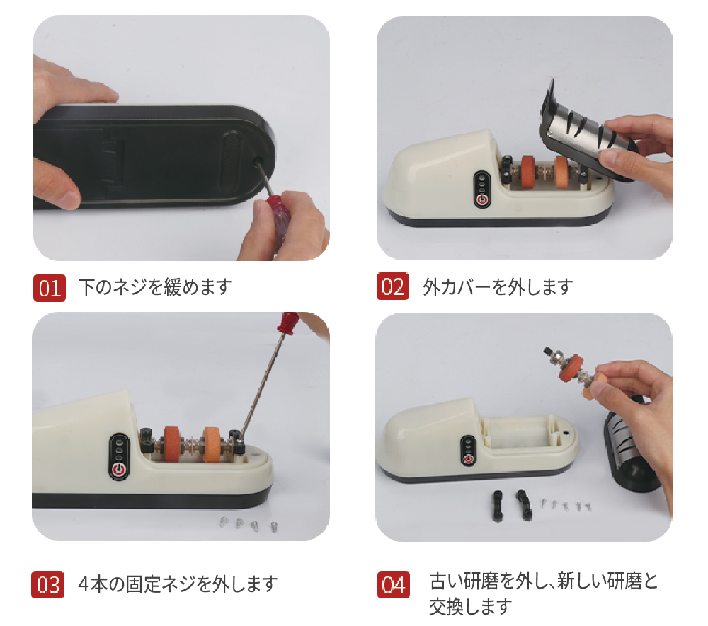 切れ味が悪くなった刃先をダイヤモンド鋼で研ぎ、仕上げに細かい研磨で研ぎます。2つの研磨を使用し、より切れ味がよくなるように仕上げてくれます。