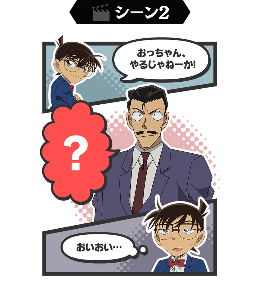 コナンと小五郎とで何やら会話をしています。何と言っているのか「?」を考えてみよう!