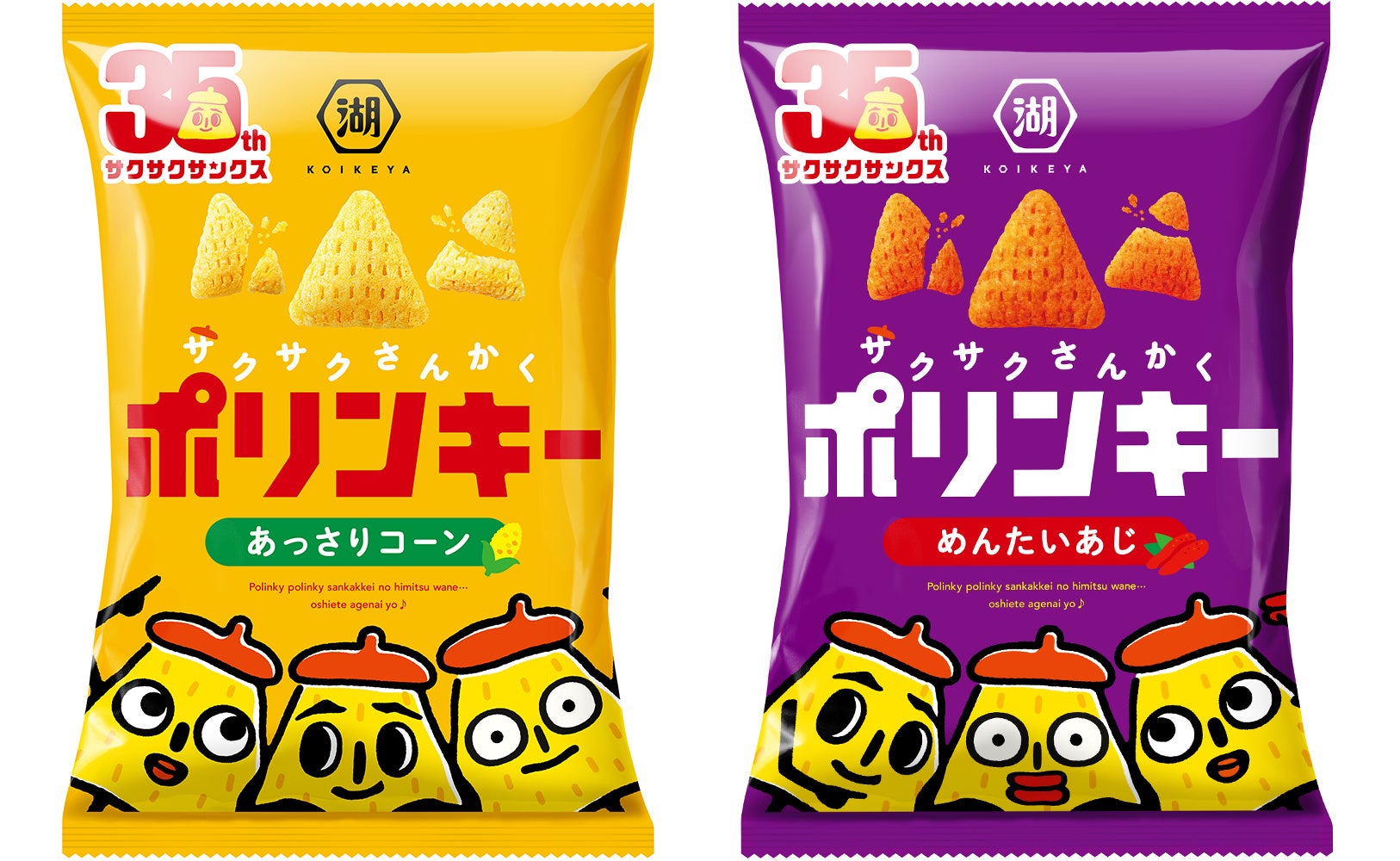 さらに、「ポリンキー」ブランド35周年を記念して、定番の「あっさりコーン」「めんたいあじ」にも35周年マークを入れ、2025年7月7日(月)より展開を開始します。
