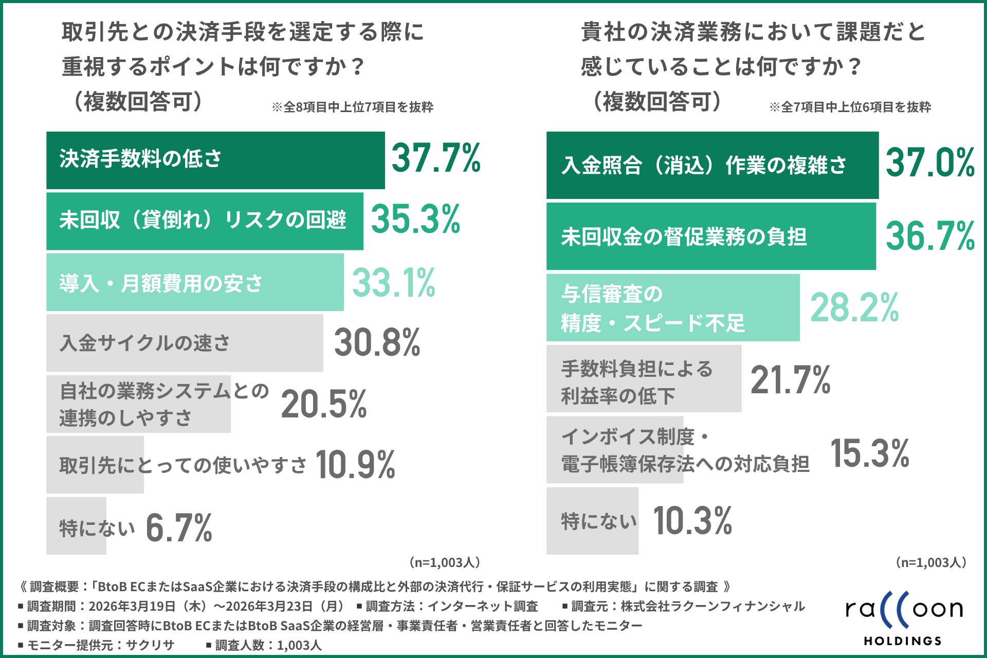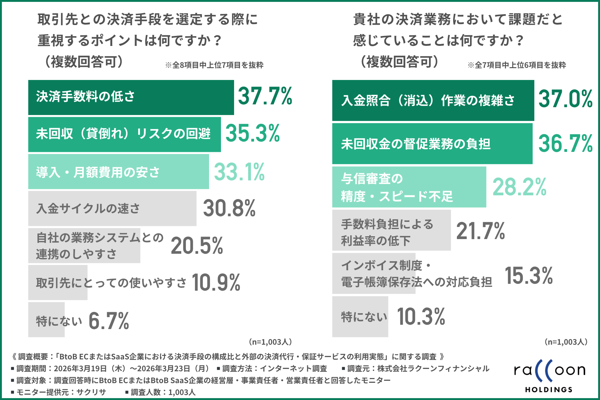 取引先との決済手段を選ぶ際は、「決済手数料の低さ」と「未回収リスクの回避」「導入・月額費用の安さ」というポイントが重視されています。しかし、実務現場では「入金照合(消込)の複雑さ」や「未回収金の督促業務の負担」「与信審査の精度・スピード不足」といった課題があることがわかりました。