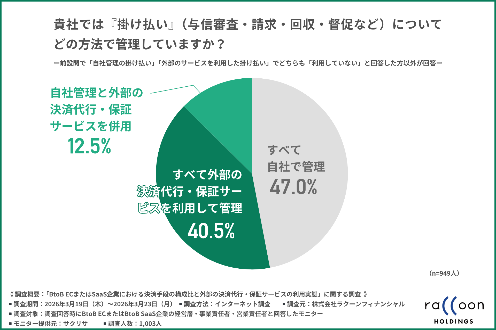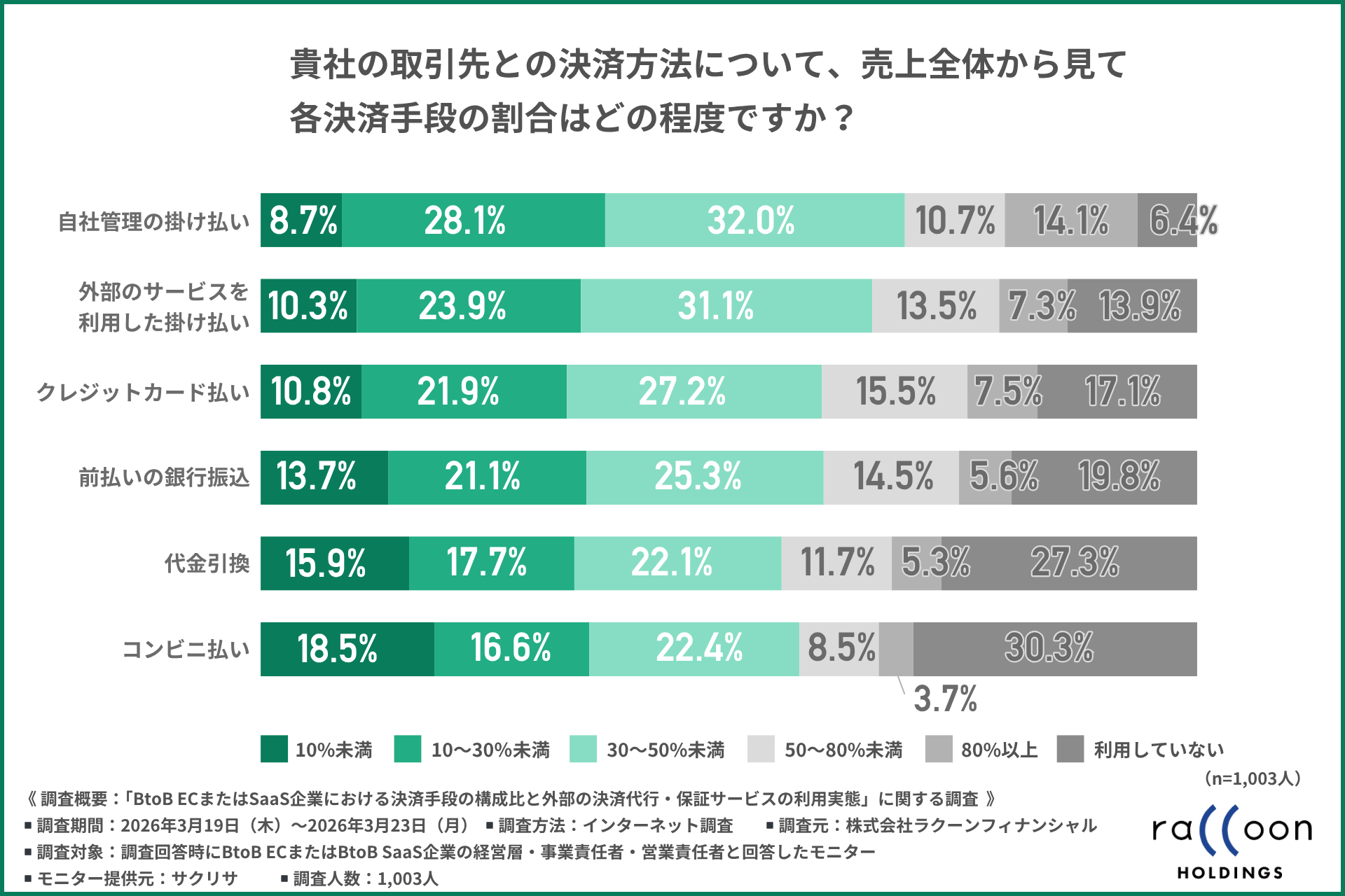 株式会社ラクーンフィナンシャル(所在地:東京都中央区、代表取締役社長:秋山 祐二)は、BtoB ECまたはBtoB SaaS企業の経営層・事業責任者・営業責任者を対象に、「BtoB ECまたはSaaS企業における決済手段の構成比と外部の決済代行・保証サービスの利用実態」に関する調査を行いました。