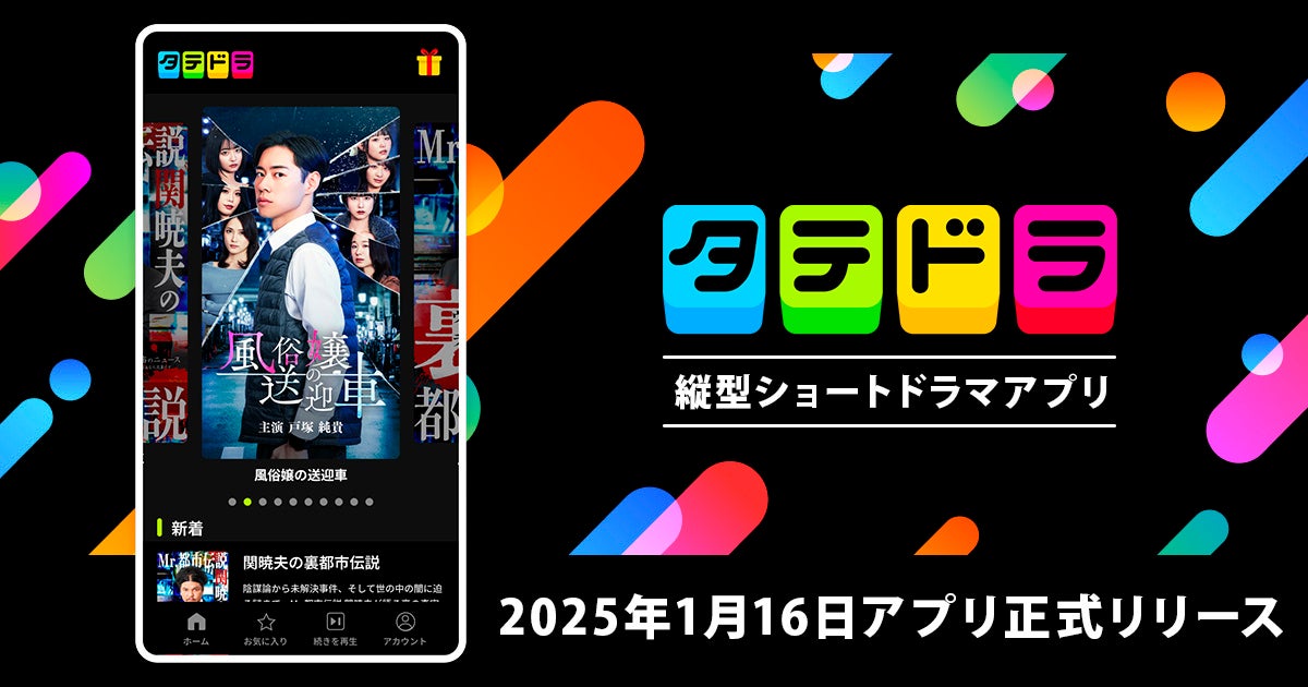株式会社DONUTS(東京都渋谷区、代表取締役:西村啓成)は、縦型ショートドラマアプリ「タテドラ」を2025年1月16日(木)14時よりApp StoreおよびGoogle Play ストアにて正式リリースしました。