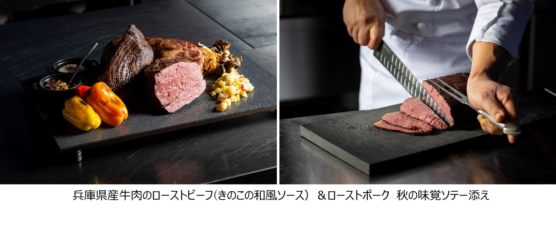 「ブルーオーシャン オルカスタディアム」は、西日本で唯一シャチを眺めながら食事が楽しめるレストランとして、神戸須磨シーワールド随一の人気を誇ります。この度、9月1日(日)より、ブッフェメニューに秋限定のメニューが加わります。お客様の目の前で調理するライブキッチンでは、牛出汁で作ったきのこたっぷりの和風ソースで仕上げた、兵庫県産牛肉のローストビーフとローストポークをご提供いたします。また、丹波産黒豆を使用したほんのり甘いイタリア風オムレツや、旬の秋鮭と六甲マッシュルームを使用したクリームパスタなど秋の味覚をふんだんに使用したメニューの数々をご用意しております。