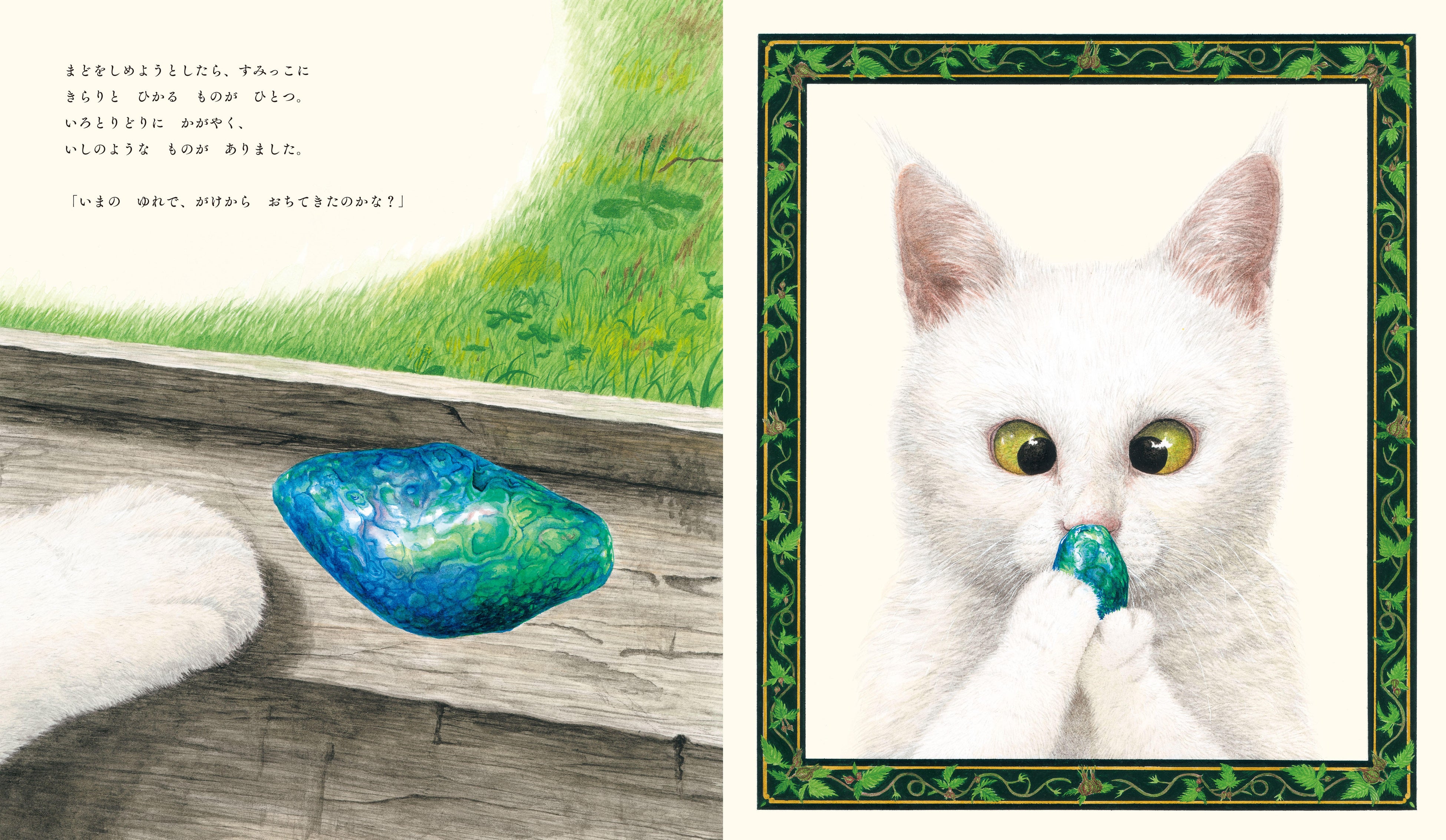 ある朝、猫は色とりどりにかがやく石のようなものを見つけます。