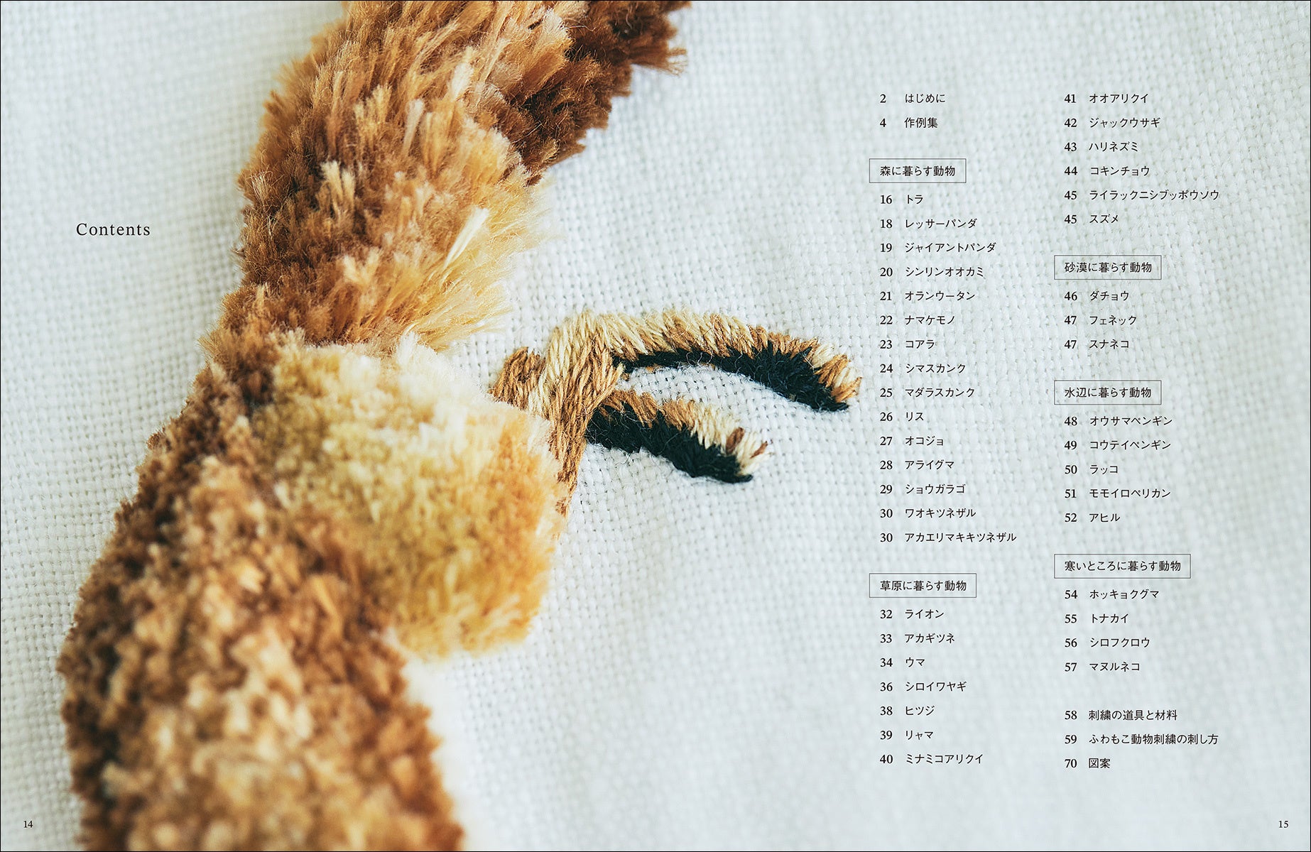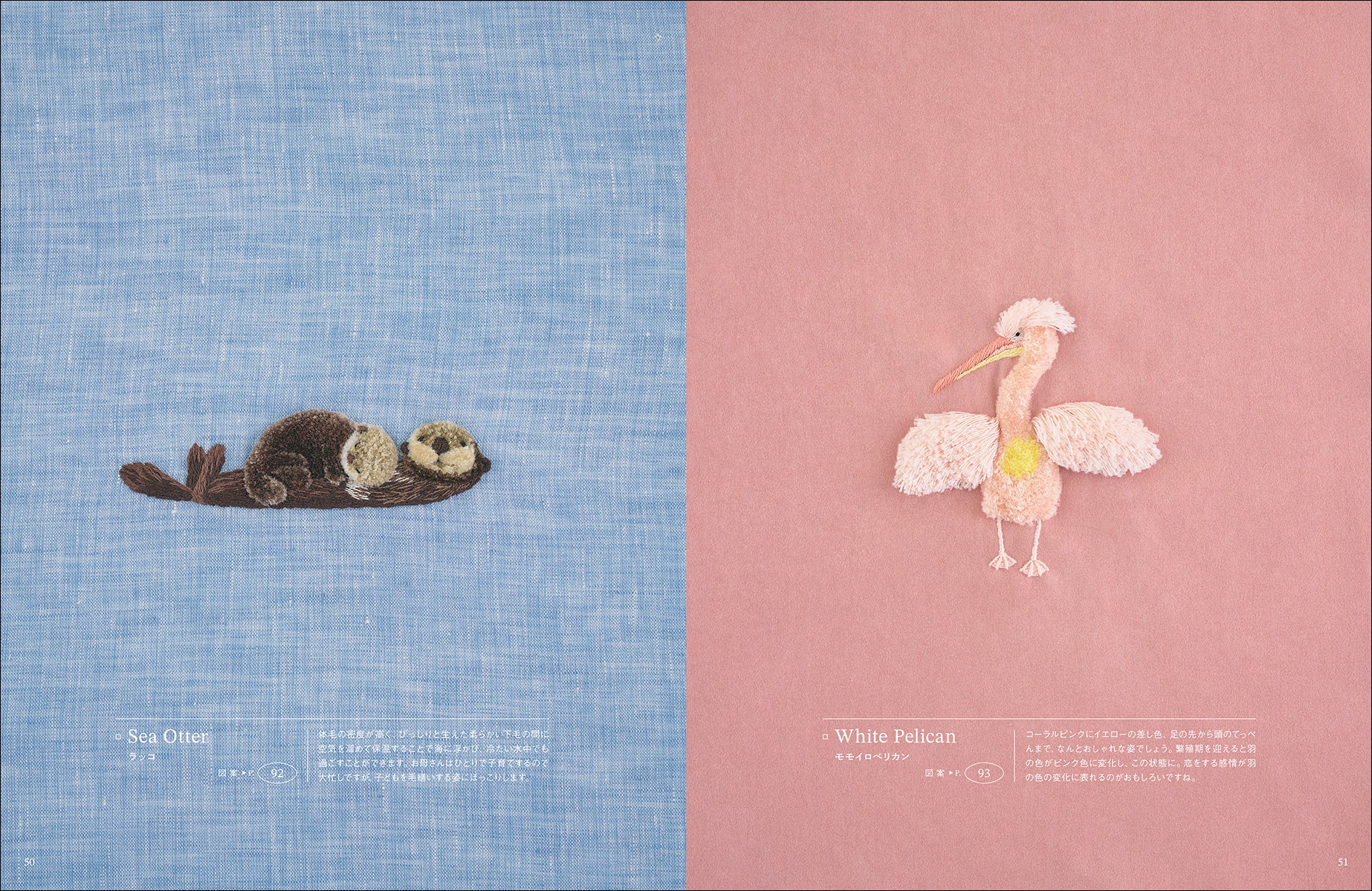 この本ではシンリンオオカミ、オランウータン、ダチョウ、マヌルネコなど野生動物を中心にスミルナステッチを用いて刺繍をしてもらいました。