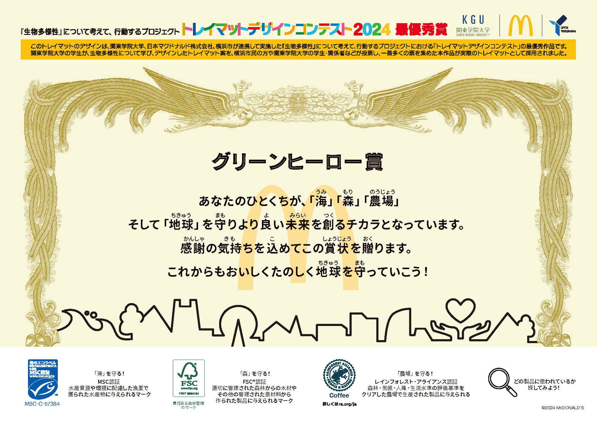 関東学院大学、日本マクドナルド株式会社及び横浜市の産官学連携で、生物多様性の重要性を学び、普及啓発に取り組む、「トレイマット デザイン コンテスト」を開催しました。