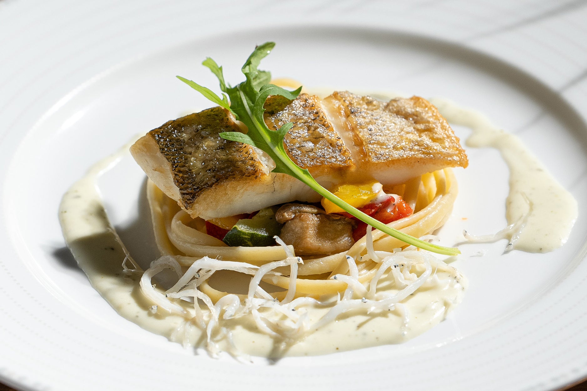 香ばしくホクホクに焼いたスズキのローストが主役のひと皿。トマトやズッキーニなど夏野菜が彩りを添え、白ワインベースのまろやかなソースが白魚と野菜の旨味をより一層引き立てます。