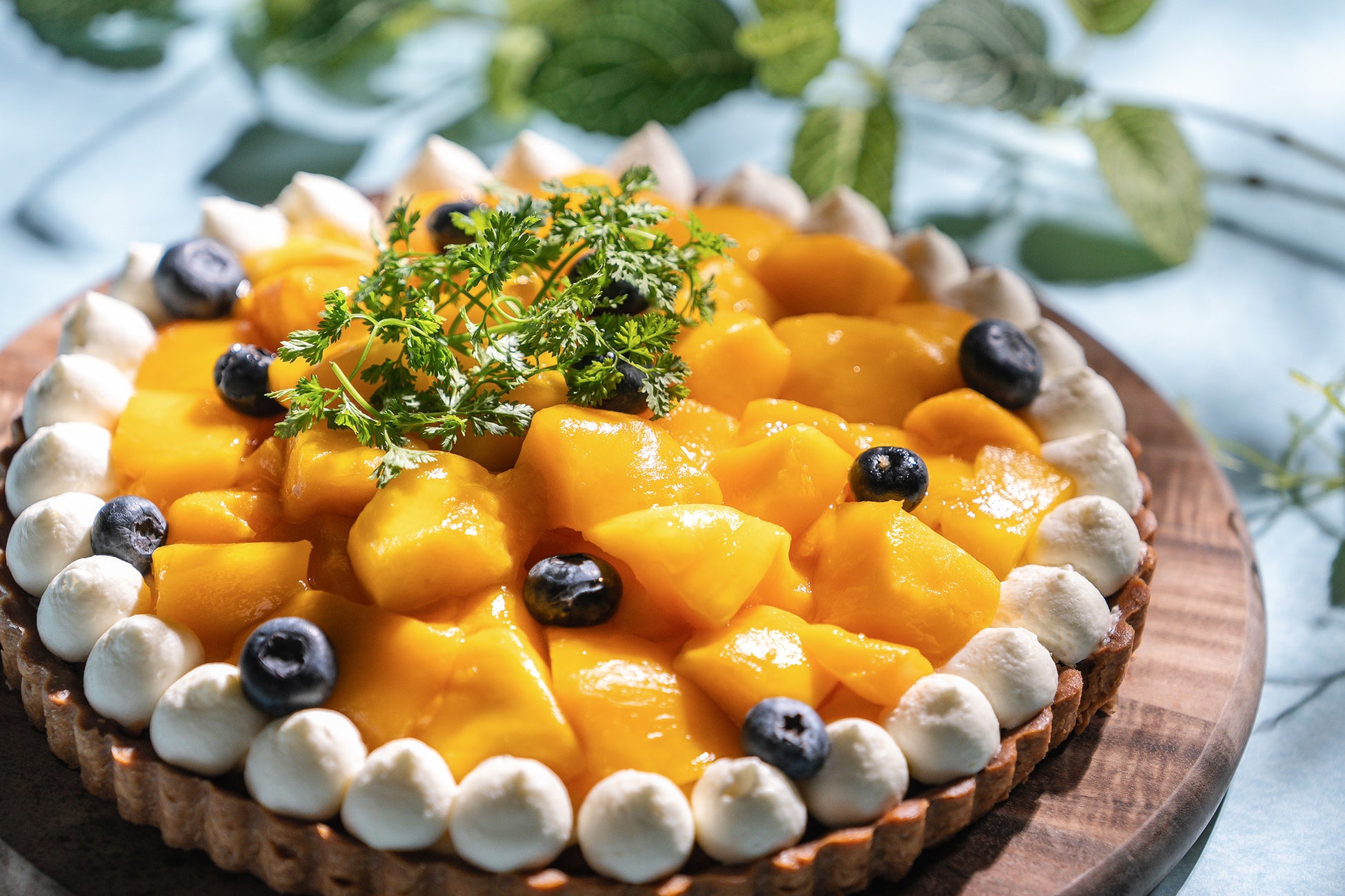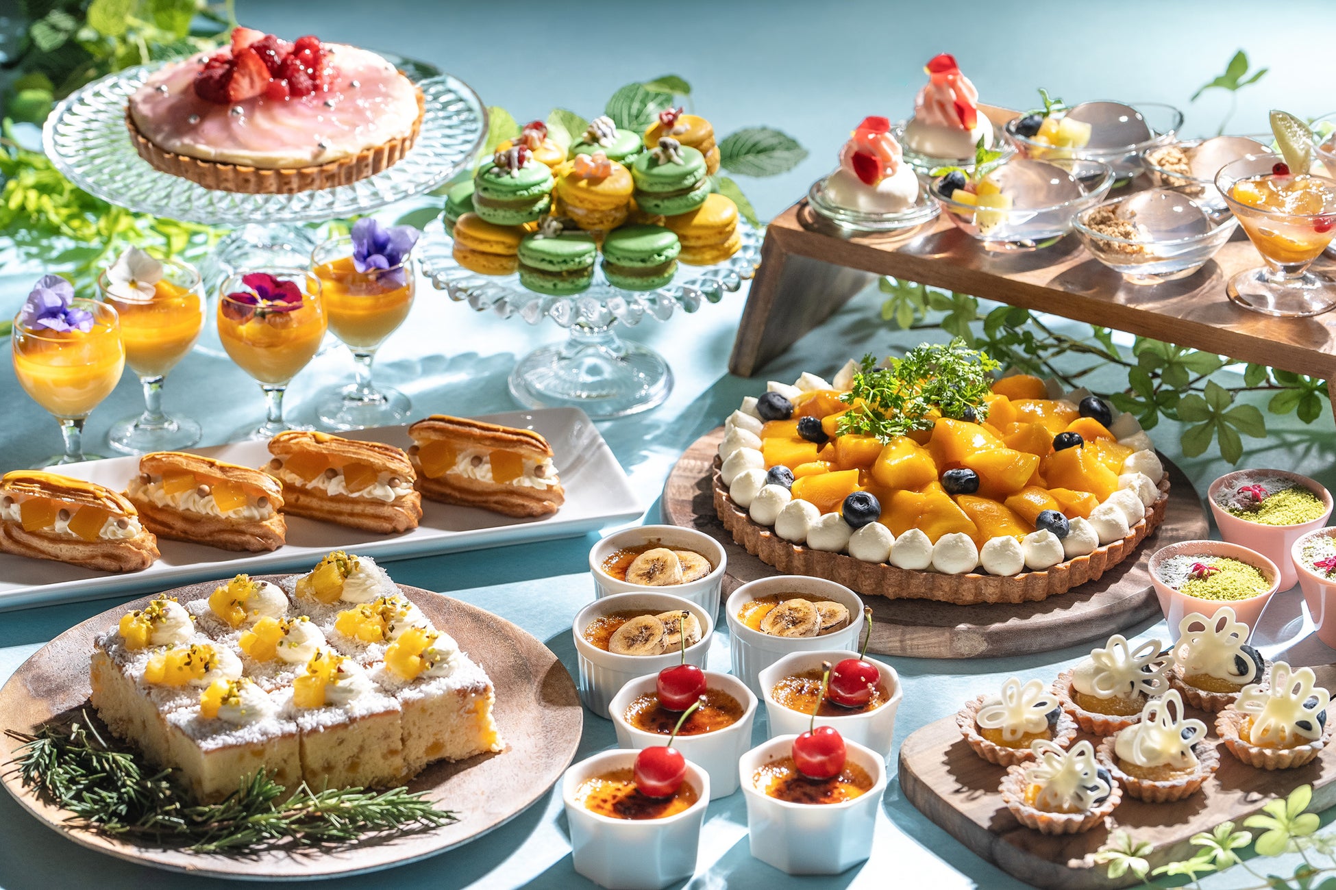 季節のフルーツタルト(マンゴーとブルーベリー〈6月~〉、桃とラズベリー〈7月中旬~〉)/レモングラスのジュレ/マンゴープリン/桃のムース/抹茶のティラミス/水わらび餅/グリオットチェリーのブリュレ/マカロン/ココナッツとパインのケーキ/トロピカルフルーツのエクレア