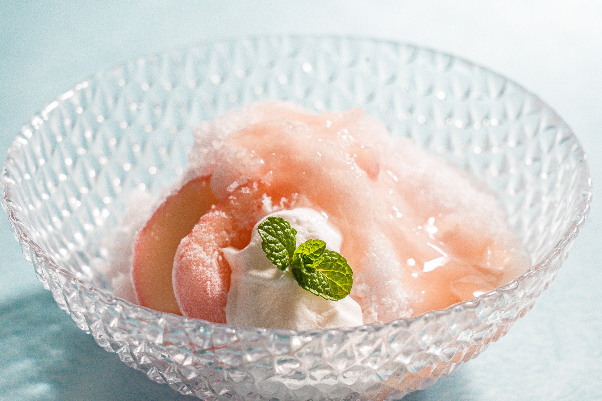 ふんわり空気を閉じ込めたような氷に、甘美な香りと凝縮されたフルーツシロップをたっぷりと注いだ涼やかなひと皿。豊かな味わいが口中に広がり、心地よい喉越しをお楽しみいただけます。