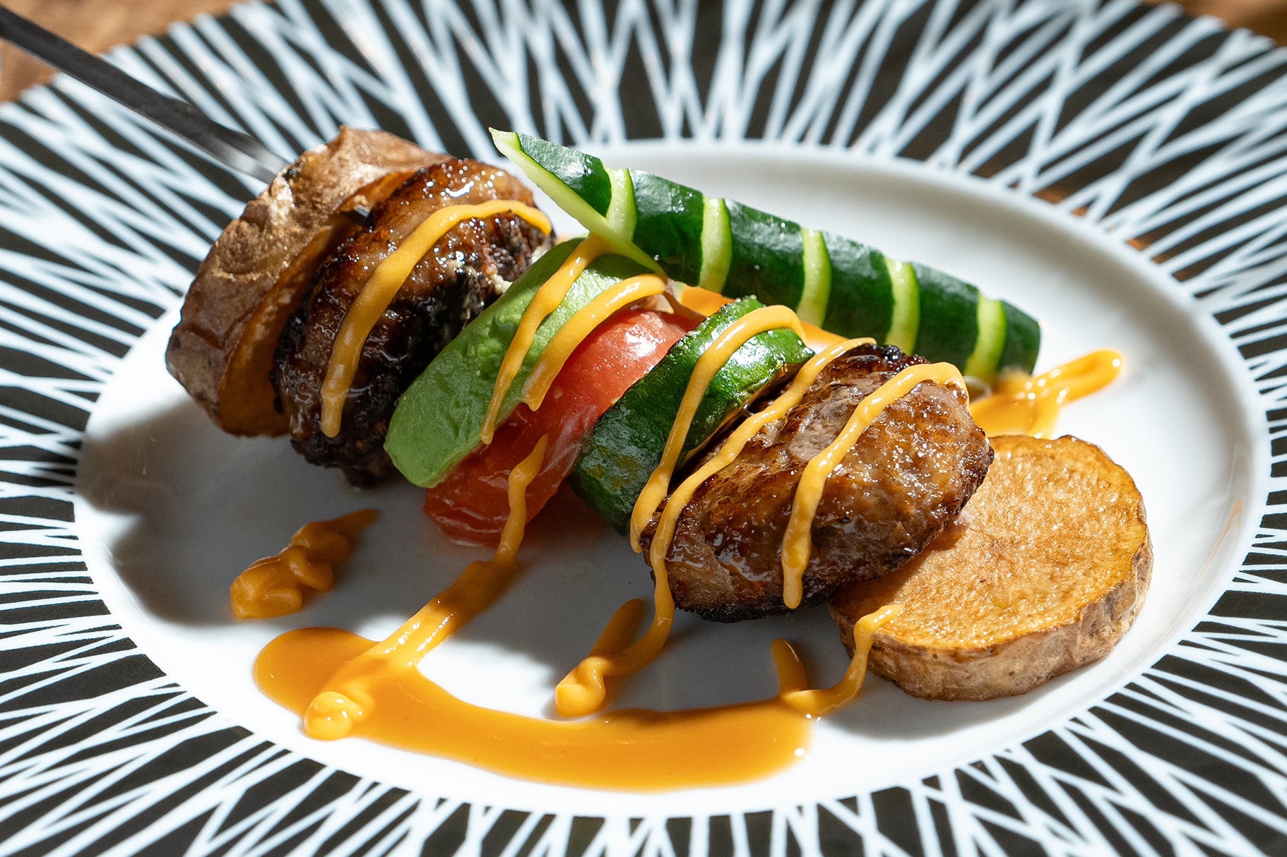 香ばしく焼いたハンバーグ、アボカドの濃厚な風味、トマトの酸味、ジャガイモのホクホク感が絶妙にマッチ。見た目はBBQを思わせつつ、ハンバーグの旨味とハンバーガー風の味わいとが融合した独創的なひと皿です。