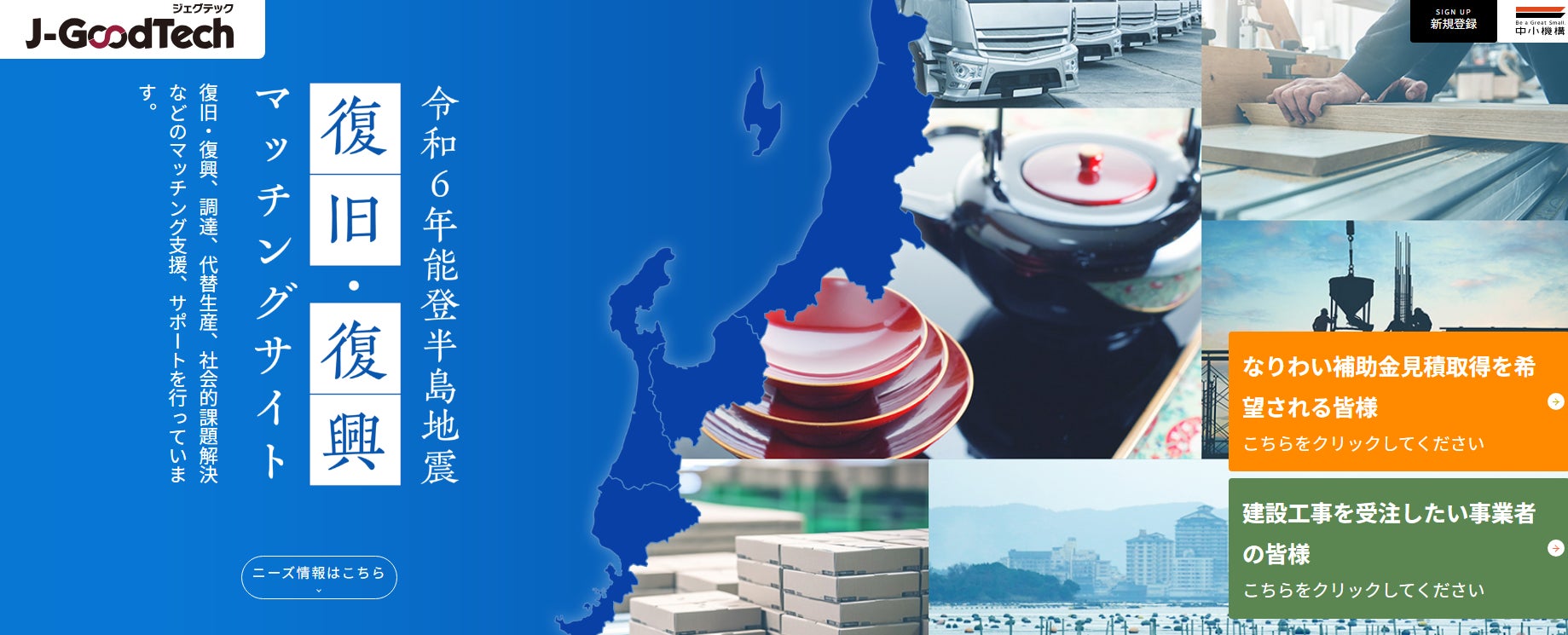独立行政法人中小企業基盤整備機構(理事長:宮川正 所在地:東京都港区)と石川県は、能登半島地震で被災された中小企業の皆様が早期に事業を再開できるよう、中小機構が運営する「復旧・復興マッチングサイト」を活用し、被災企業と地元以外の工事業者とのマッチングや被災企業のなりわい再建支援補助金に必要な見積書の取得をサポートする事業を開始しました。