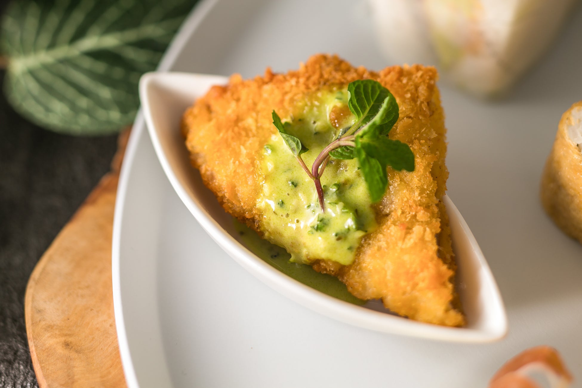 スパイシーなフィッシュフライをさっぱりとしたハーブソースと爽やかなミントでどうぞ。