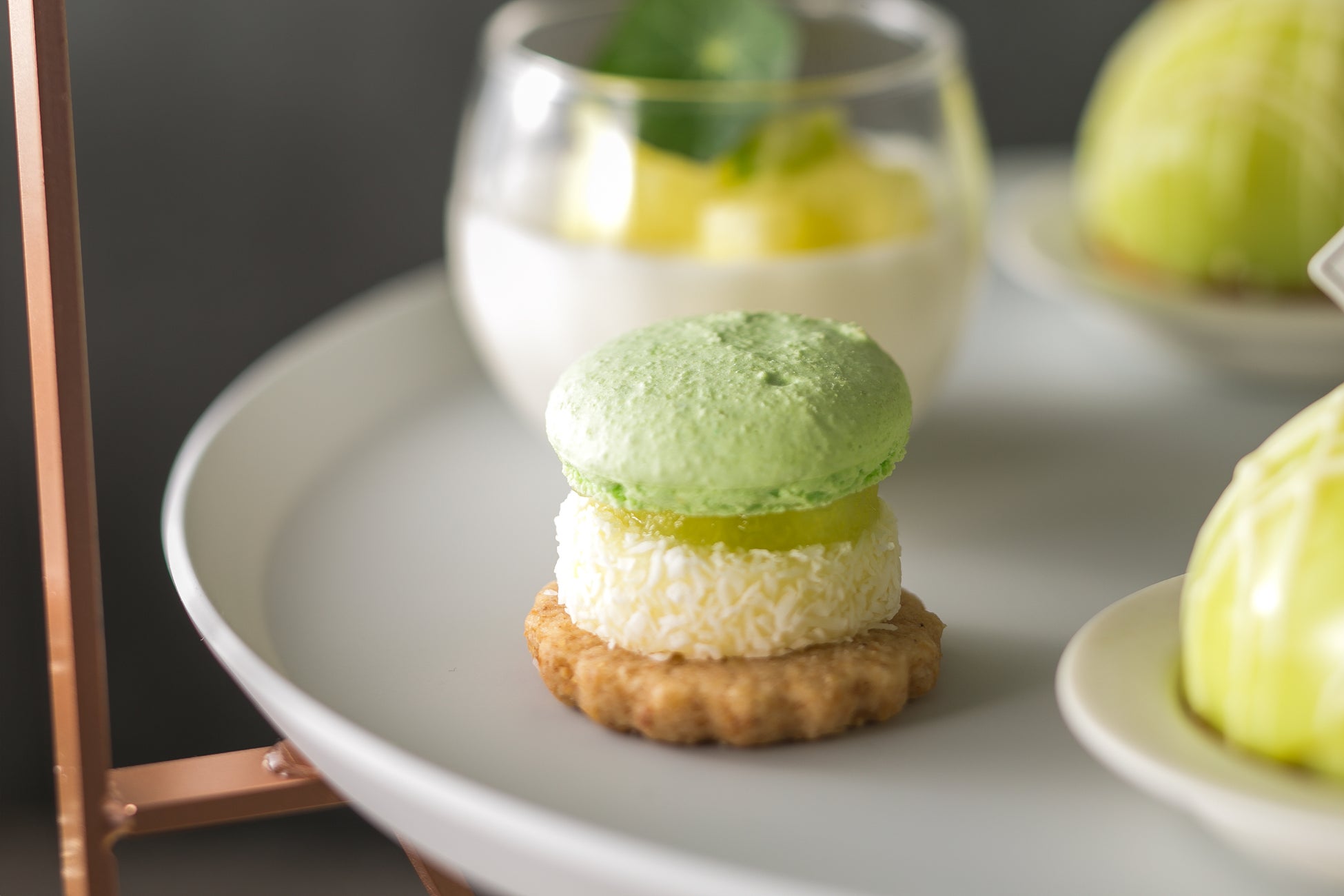ココナッツサブレの上に、ココナッツファインでコーティングしたガナッシュを乗せ、フレッシュメロン、マカロンを重ねました。