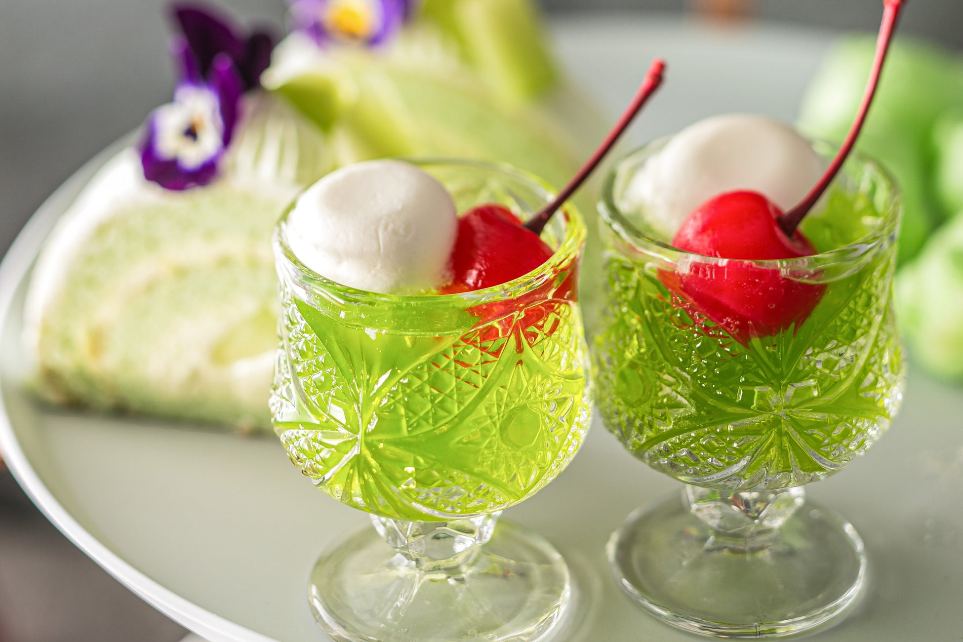 昔懐かしメロンソーダをミニサイズで。メロンジュレのグラスにメロンソーダを注ぎ、クリームとチェリーをトッピング。