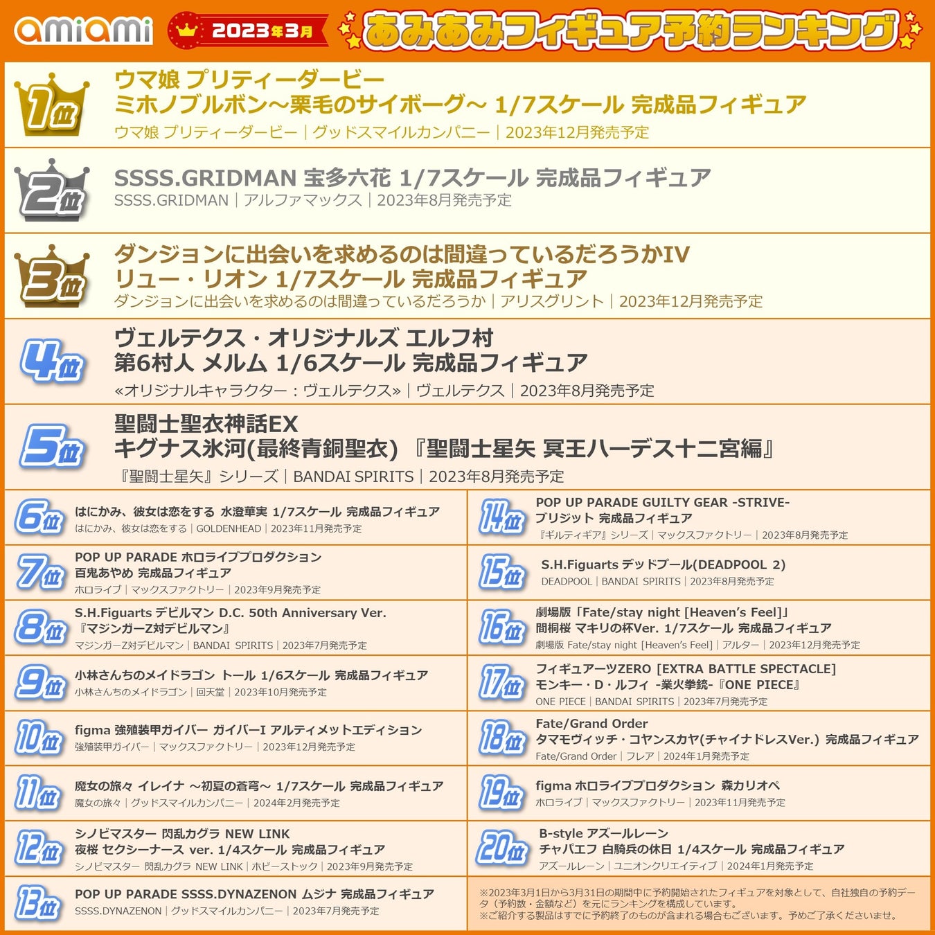 - ホビーショップ『あみあみ』の「2023年3月フィギュア予約ランキング」を発表!