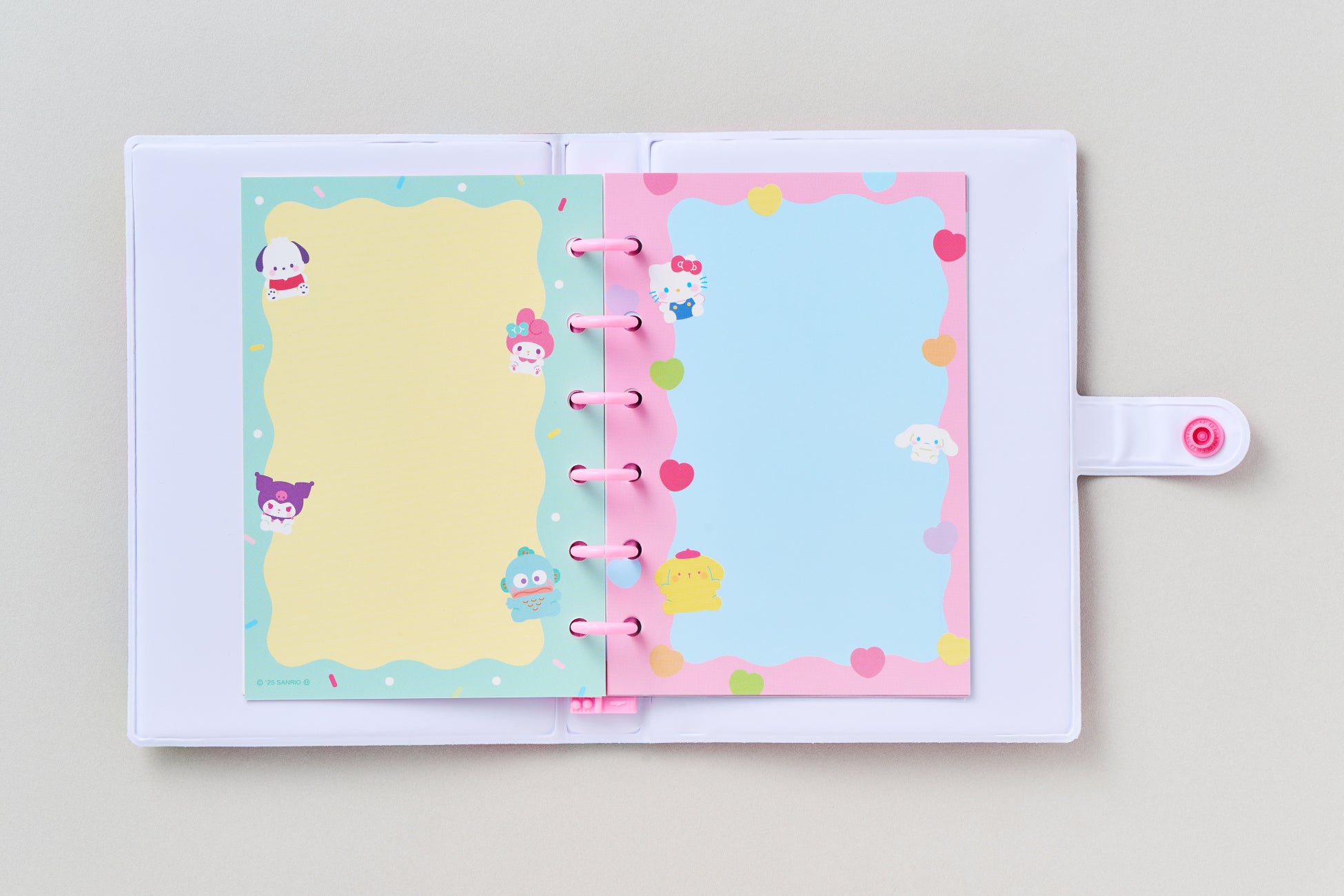 かわいいシールページ1枚と、シール台紙が2枚、メモ3枚に、総柄OPP袋1枚がついたもりだくさんの手帳♡ おともだちとシール交換もできちゃう♪