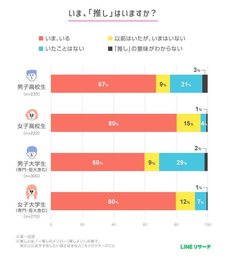 【LINEリサーチ】女子高校生・女子大学生の約8割が“いま、推しがいる”!推しのジャンル1位はアイドル