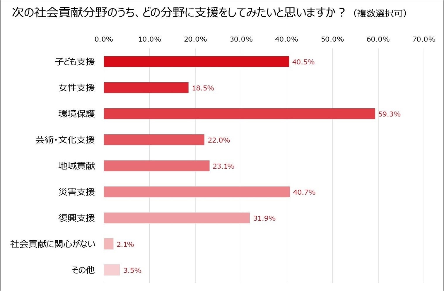 買い物時に意識するサステナブルな視点を尋ねたところ(複数選択可)、物価高の影響もあってか、「長く使えるものを買う」という回答が全体の約8割と最も多かったものの、「環境や社会のためになる商品を積極的に買う」「生産・製造時に環境に負担をかけない商品を買う」など、環境への配慮につながる商品の購入意向があるとの回答も一定数見られました。さらに、支援したい社会貢献分野(複数選択可)についても、約6割が「環境保護」と回答。当社のお客様は自然環境を一番身近な社会課題として捉え、それに対する意識が高いという結果となりました。