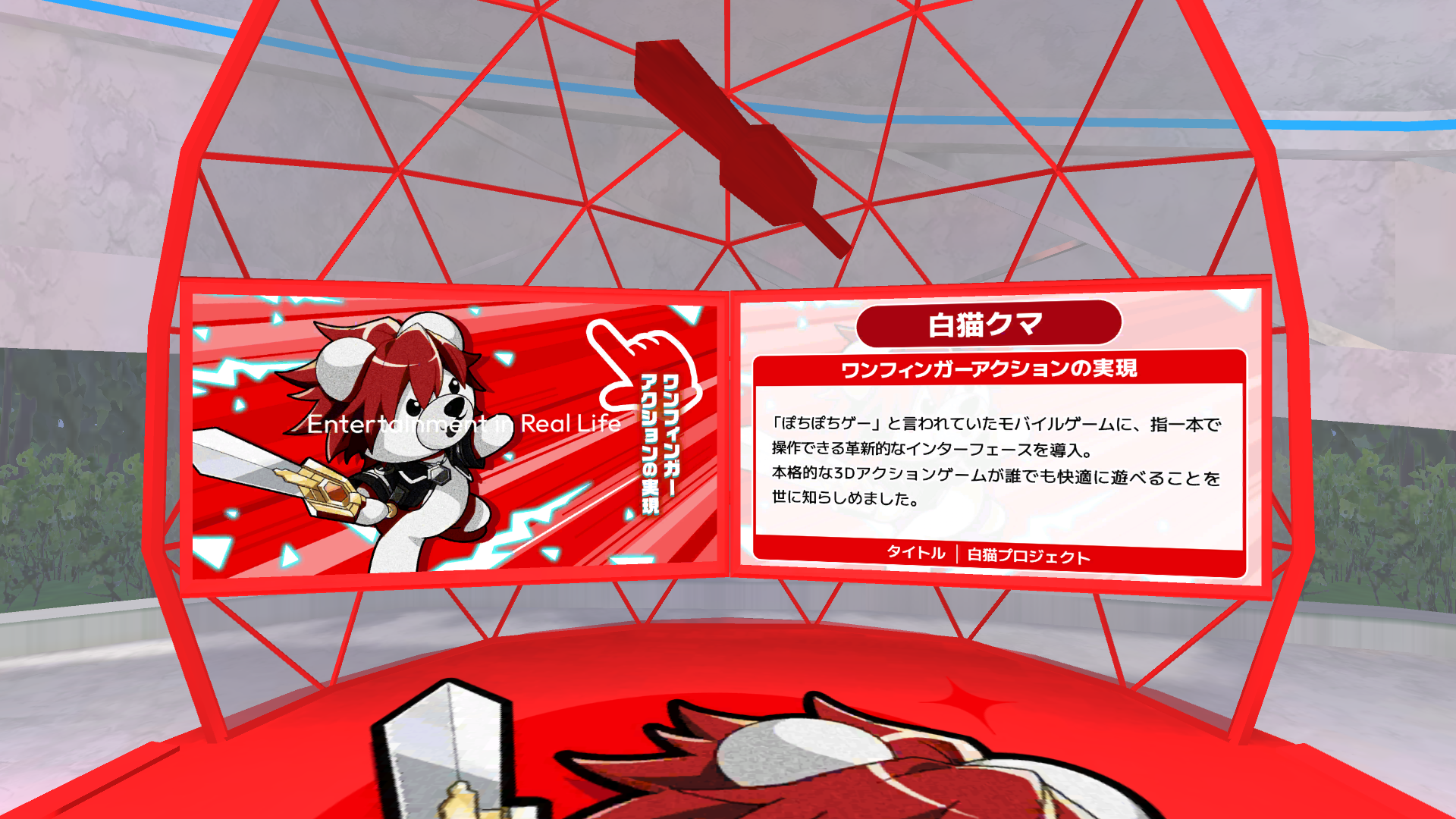 それぞれのクマが表現している「コロプラが実現したこと」「活用した技術」「それらを代表するゲーム」などが紹介されており、従業員はクマのアバターを使い、空間内の情報を回遊できるようになっています。