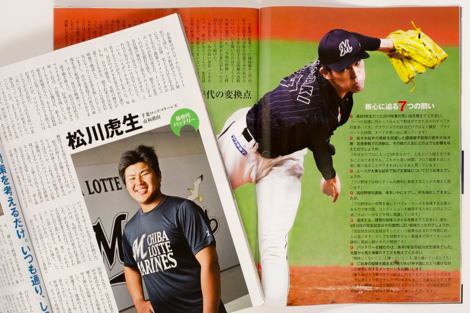 まずは「新世代バッテリー」の佐々木朗希、松川虎生(こう)にフォーカスします。岩手・大船渡高校を卒業して3年目、今年、日本のプロ野球史上最年少の20歳で完全試合を達成した佐々木には「核心に迫る7つの問い」をぶつけました。丁寧な回答に人柄がにじみます。市和歌山高校からドラフト1位でロッテに入団、プロ野球が2リーグ制になって以降、史上3人目となる高卒1年目で開幕マスクをかぶった18歳の松川には、インタビューで「打てる捕手」「勝てる捕手」を目指す意気込みを聞きました。