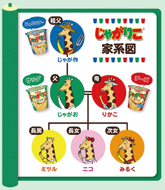「食べだしたらキリンがない」というダジャレとともに、じゃがりこのパッケージに登場するキリンたちは、実は家族。みんな名前がついていて、ダジャレ好きの一家です。「どうしてキリンがマスコット!?」と、疑問に感じた方もいるのでは。その答えは、同じくカルビーの人気商品「かっぱえびせん」が関係しています。ご存じ「やめられない、とまらない」というキャッチフレーズでロングセラーを続ける大先輩にあやかりたいと、じゃがりこの発売当時、ダジャレ好きの開発担当者の脳裏にひらめいたのが「食べだしたらキリンがない」という