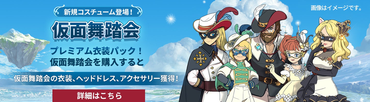 キャラクターごとに仮面舞踏会をテーマにした新しいコスチュームと帽子、アクセサリーが登場いたします。新コスチュームは、コスチューム召喚やコスチューム製作、パック商品などから入手することができます。