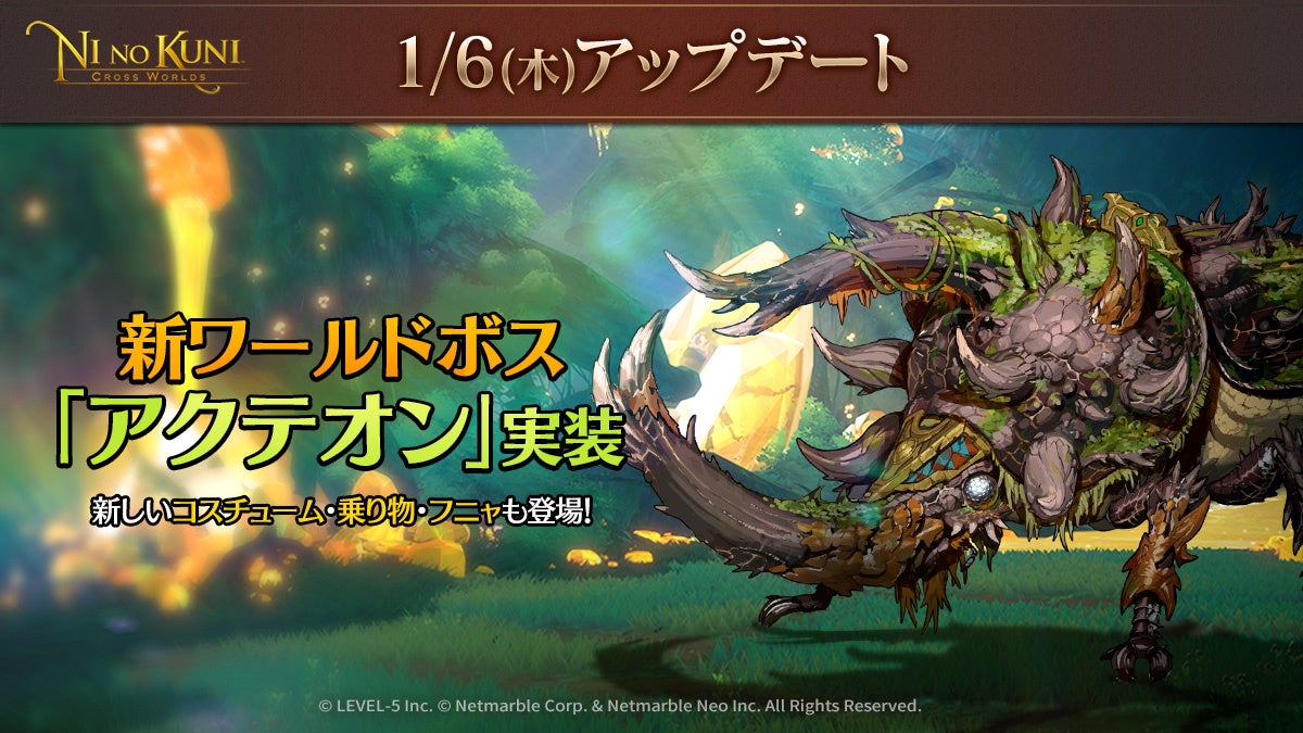 ネットマーブルは、レベルファイブとタッグを組みスマートフォン向けに開発したファンタジーアートRPG『二ノ国:Cross Worlds』(略称:ニノクロ)において、本日1月6日(木)にゲームアップデートを実施し、新ワールドボス「アクテオン」の実装に加え、新しいコスチュームや乗り物、フニャなどを追加したことをお知らせいたします。