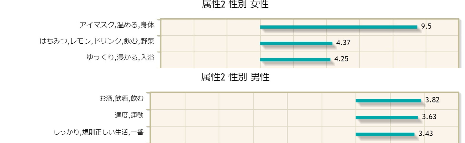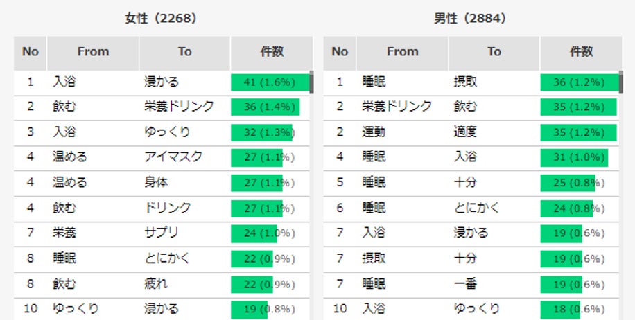 男性は「睡眠」に関する組合せが上位に来ており、女性は「入浴」「温める」といった組合せが上位に来てます。