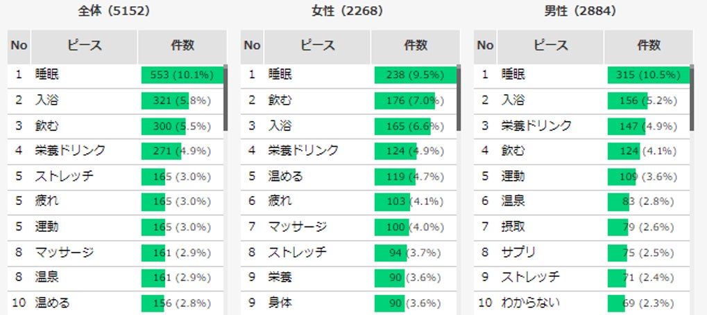 上位には「睡眠」「入浴」「飲む」といった言葉が並び、「睡眠」が疲れ・疲労により効果的な対策と考えられているようです。