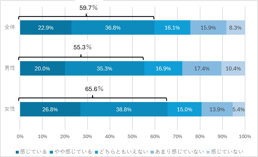 全年代総じて疲れ・疲労を感じている方が約6割おり、男性よりも女性の方が疲労を感じている傾向のようです。