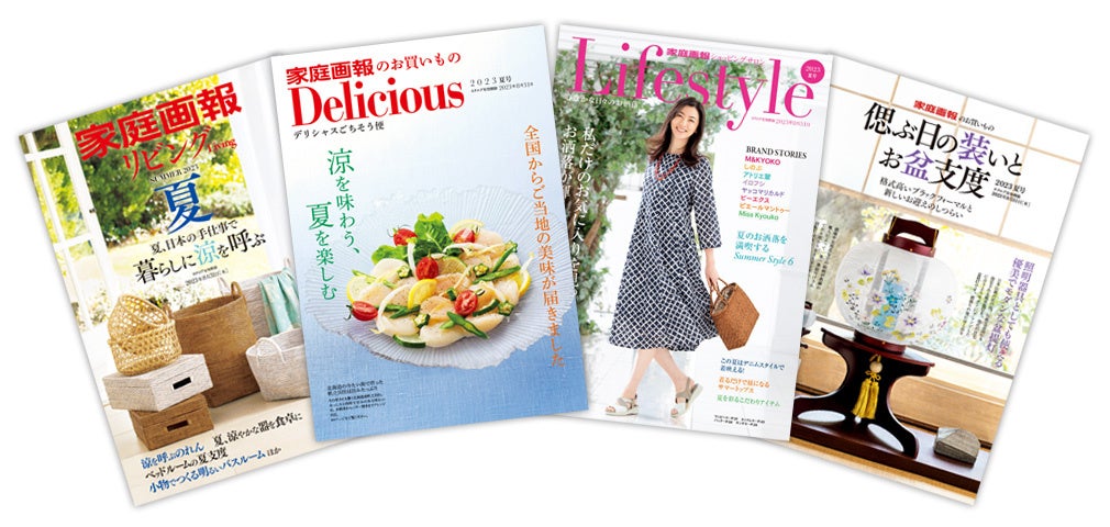 家庭画報ショッピングサロンは、2023夏号『デリシャスごちそう便』、『Lifestyle 心豊かな日々のお洒落』、『家庭画報リビング 夏』、『偲ぶ日の装いとお盆支度』の4カタログを発行し、5月12日(金)より販売を開始しました。ECサイト( https://shop.sekaibunka.com/ )でご注文いただけます。また、各カタログは、以下のオンラインカタログからもご覧いただけます。