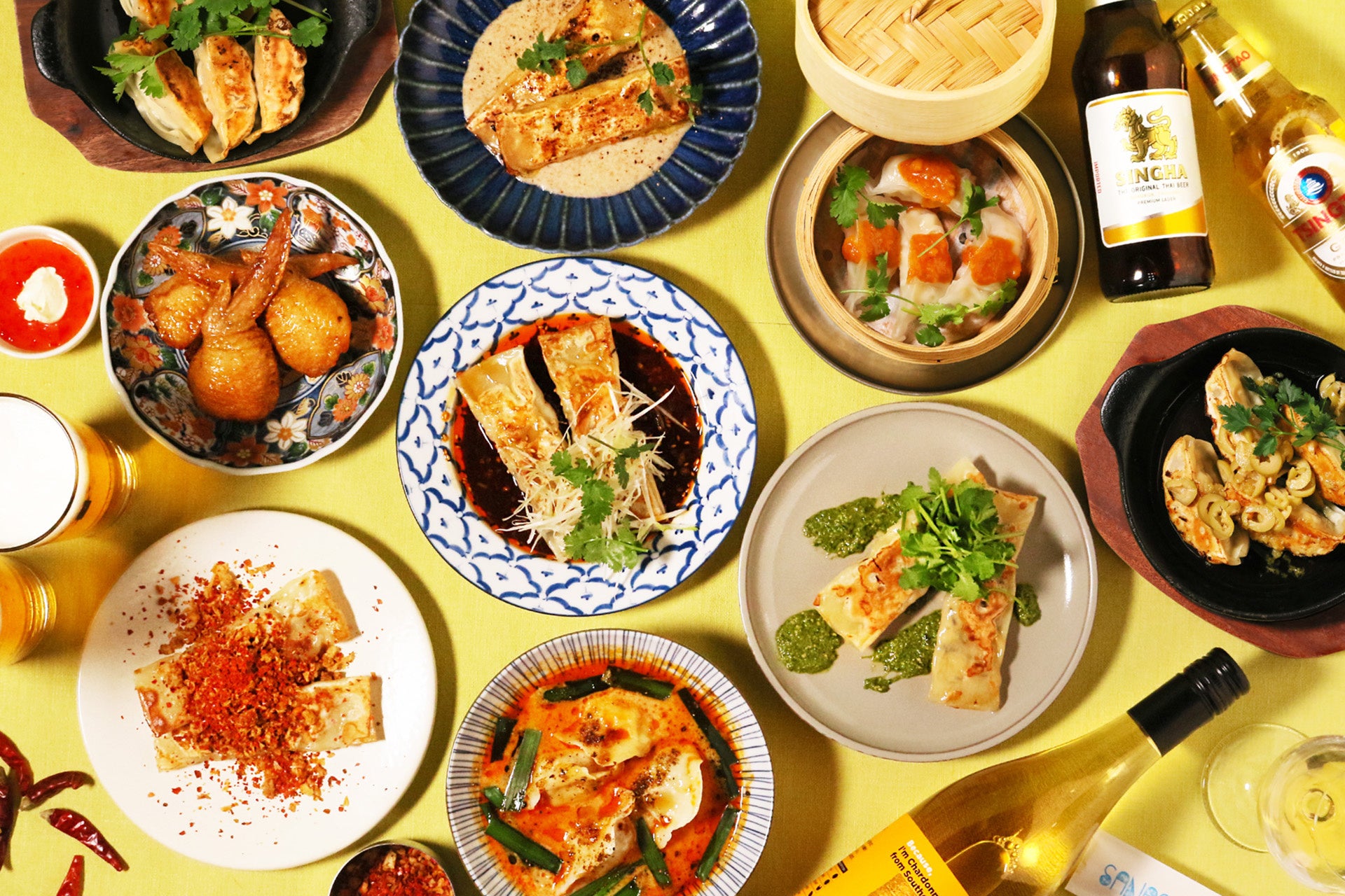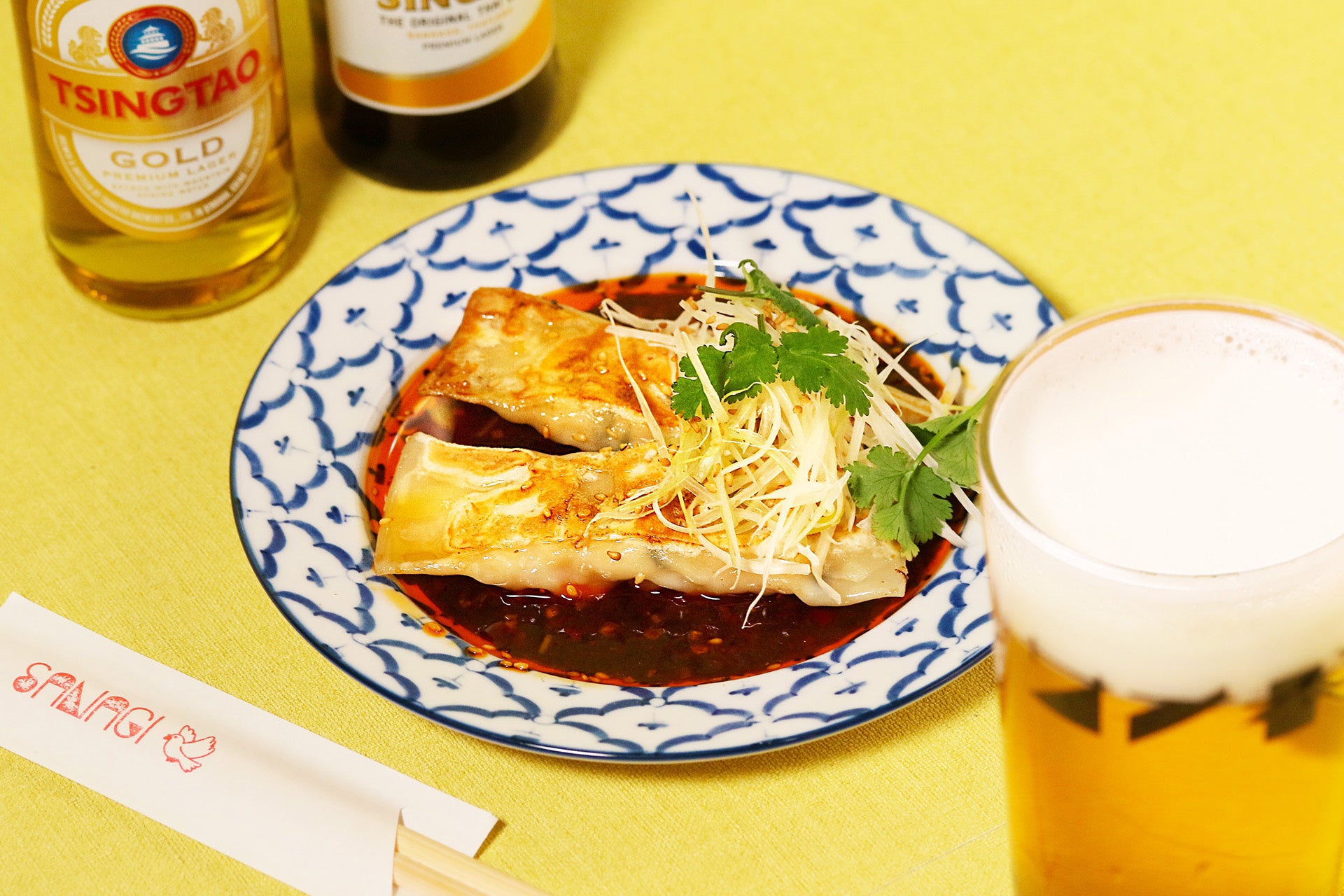 タイ生まれのシンハービール片手に、ジューシーな手羽餃子に思い切りかぶりついて。