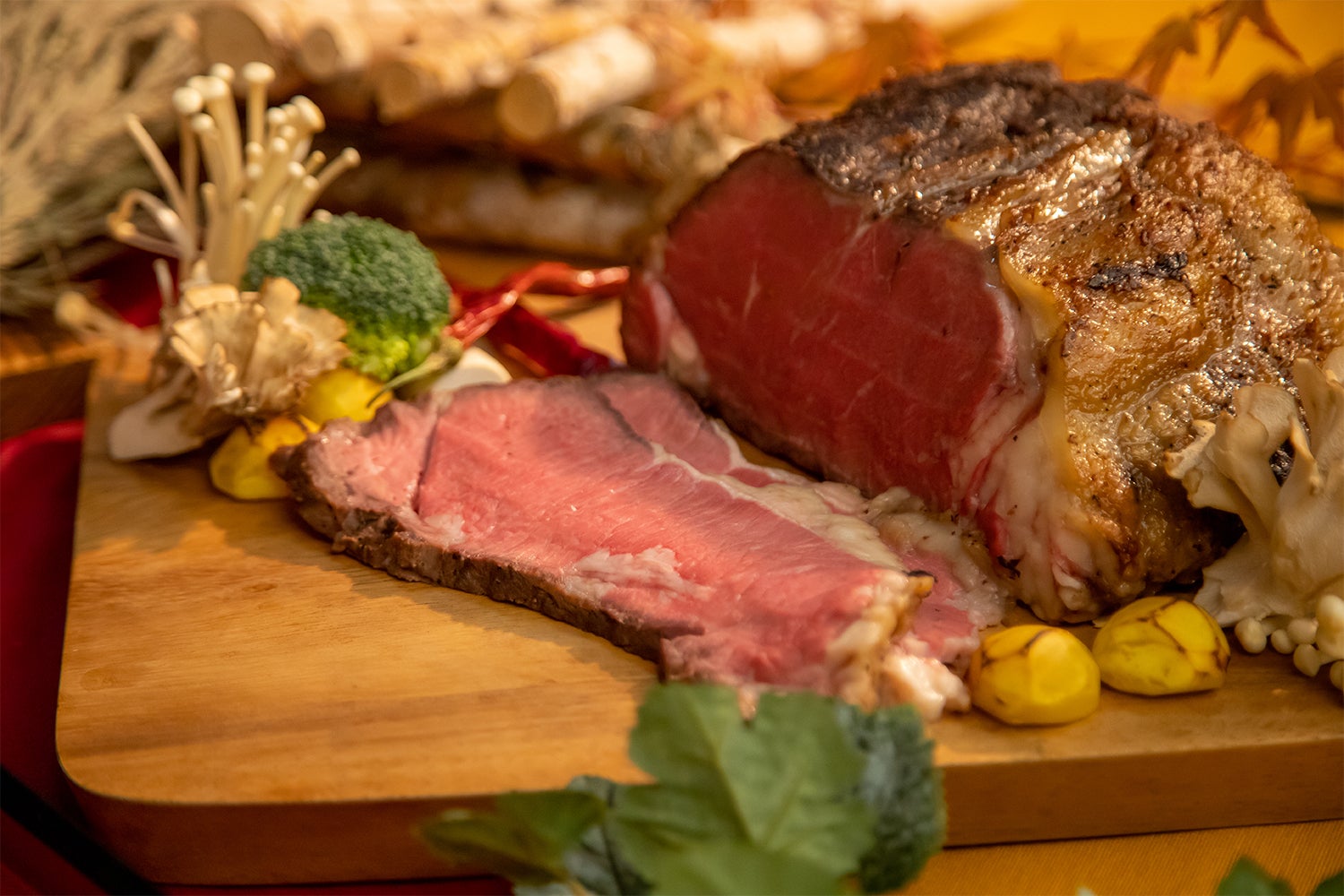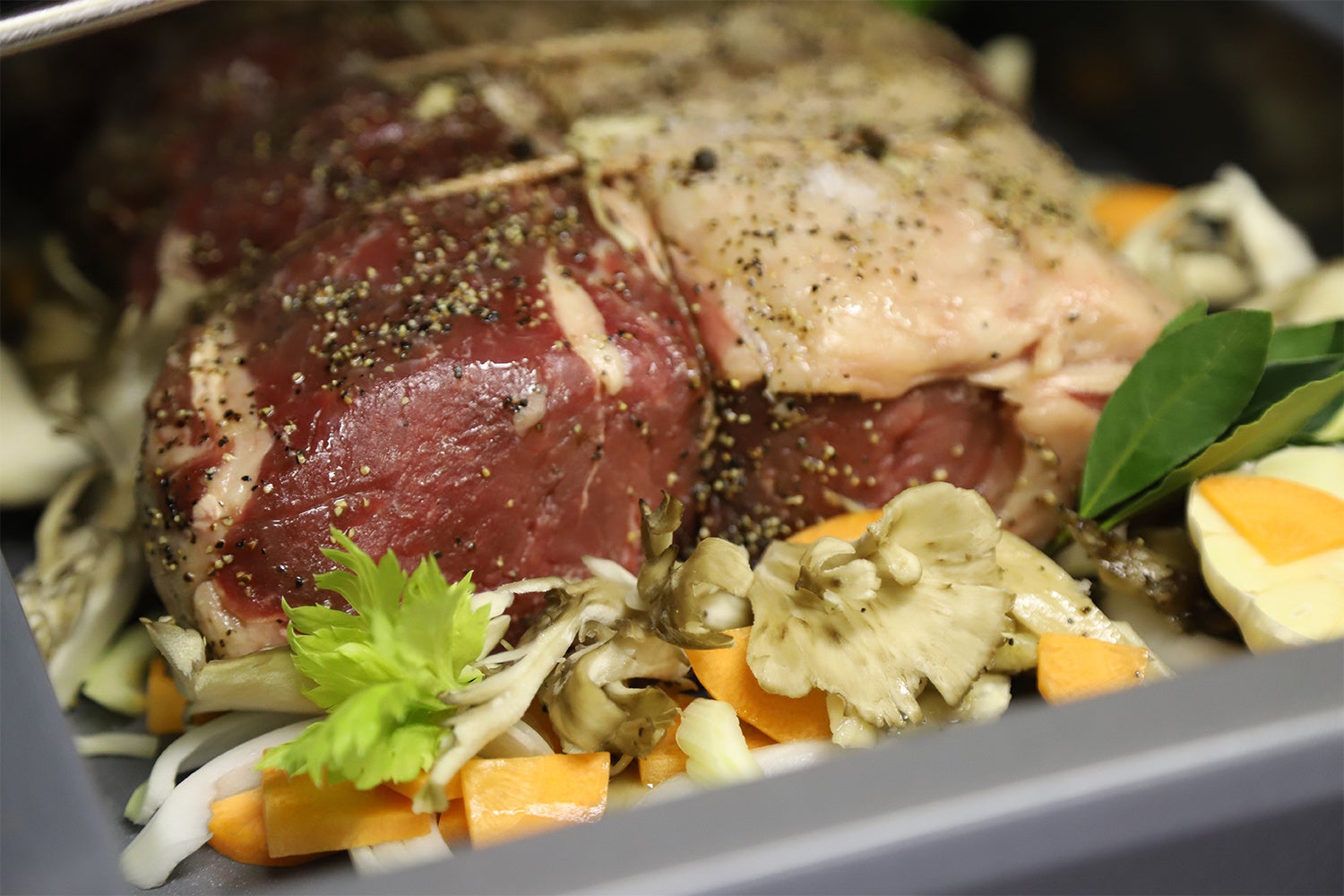 舞茸でマリネすることにより、舞茸のもつ酵素で牛肉がしっとりと柔らかくなり、さら味わい深いローストビーフを堪能することができます。