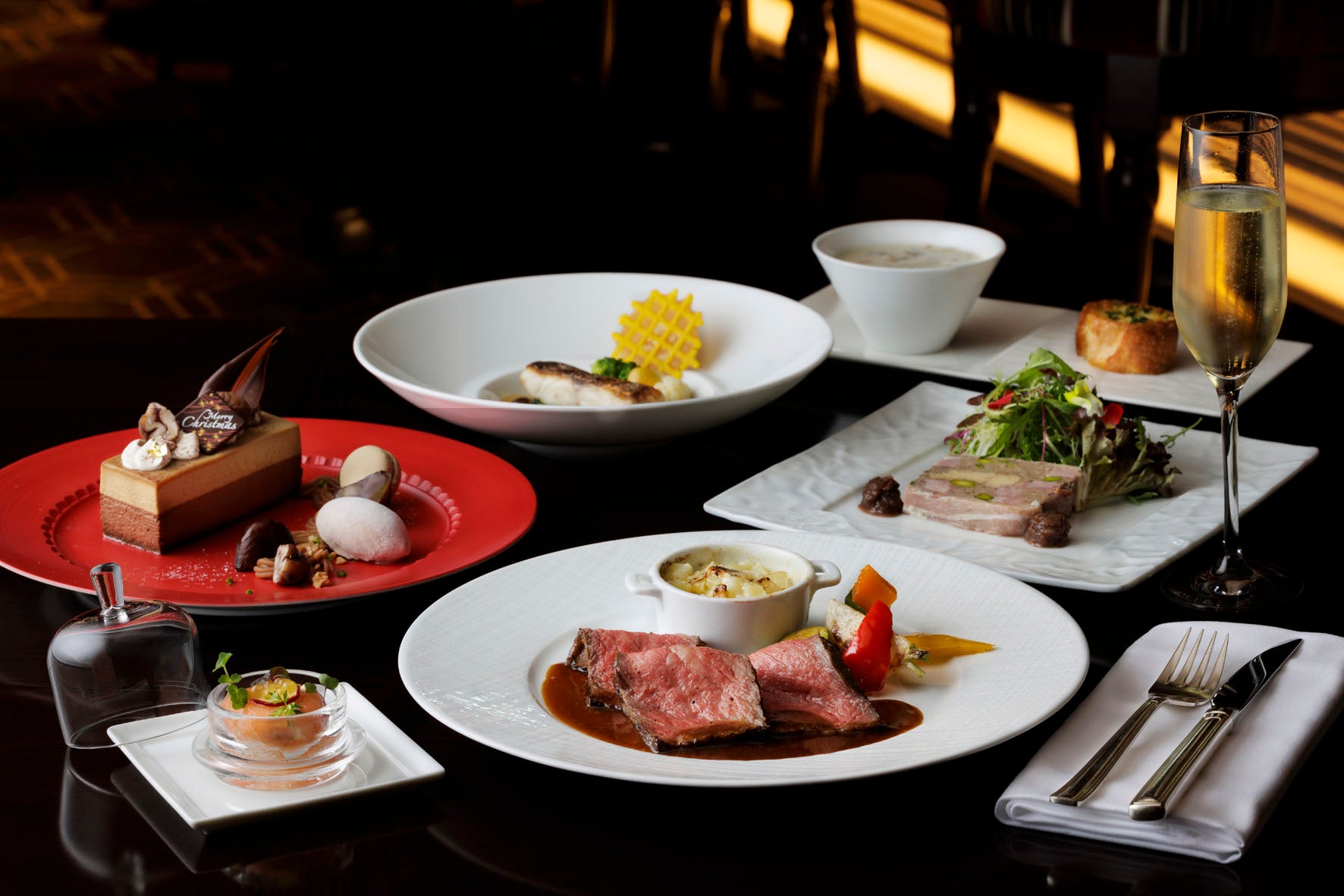 乾杯のシャンパーニュが付いた全6品のコースをご用意しました。黄金イクラを添えたスモークサーモンのオードブルや、七面鳥とフォワグラのテリーヌが、クリスマス気分を一層盛り上げます。心もほっと温まるクラムチャウダーの後には、魚料理や肉料理が続き、会話も弾む贅沢なフルコースです。