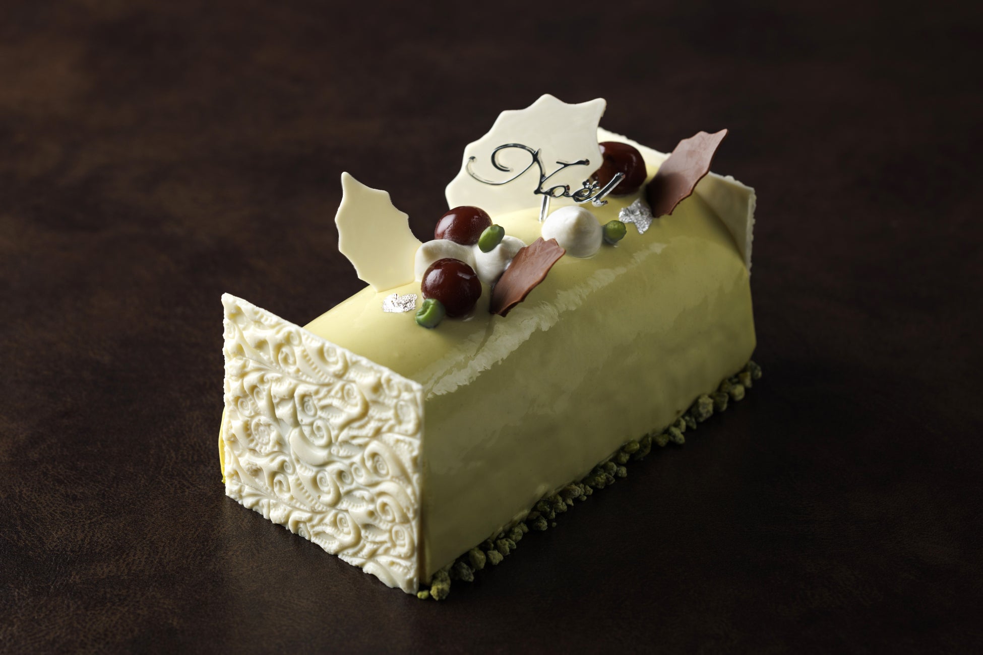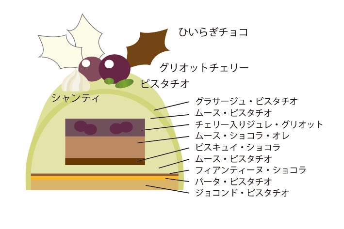 9層ものレイヤードが美しい、なめらかな舌触りのピスタチオ好きにはたまらないムースケーキ。ジョコンド(生地)にムースとペーストを足して、上質なピスタチオの風味に奥行きを出しました。優しい味わいに、ガーナ産カカオを使ったミルクチョコレートのコクや、シロップ漬けのグリオットチェリーの甘酸っぱさが変化をもたらします。柊を模ったチョコレートがアクセントの、お洒落なピスタチオカラーのブッシュ・ド・ノエルは、シャンパーニュやワインなどお酒との相性も良い大人向けのケーキです。