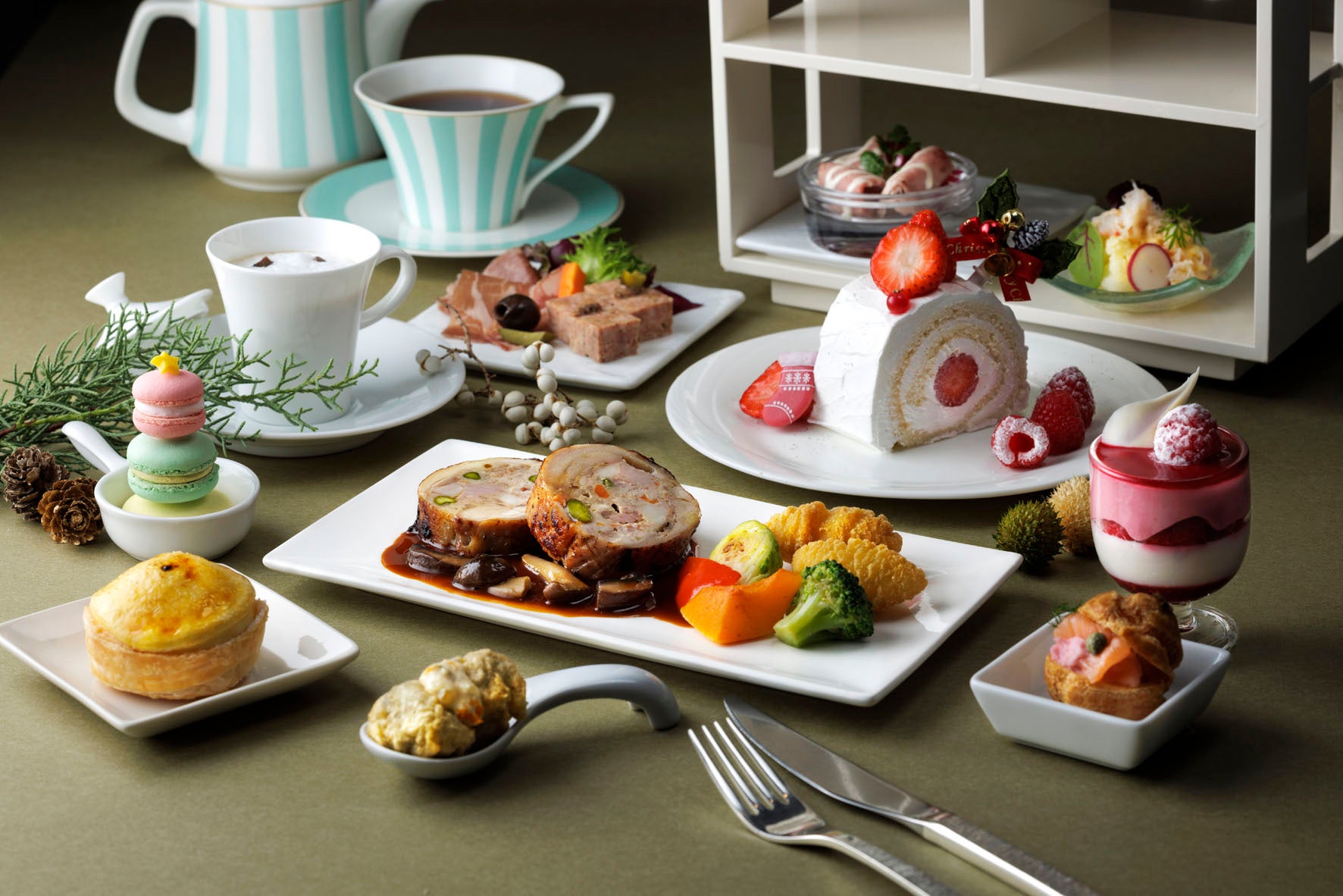 ヴェネチアンシャンデリアがエレガントに煌めくロビーラウンジでは、クリスマス限定のハイティーをご用意しました。愛らしいカラフルなマカロンツリーや、「愛の泉」を意味するパイとクリームのフランス菓子 ピュイ ダムールなど、4種の洗練されたスイーツに加え、本ずわい蟹やエスカルゴ、ローストビーフなど、クリスマスを彩る豪華なセイボリーが揃います。メインには盛り付けが美しいガランティーヌが登場し、ロマンチックな夜を演出します。セイボリーとスイーツのバランスが良く、お食事としても十分ご満足いただけます。