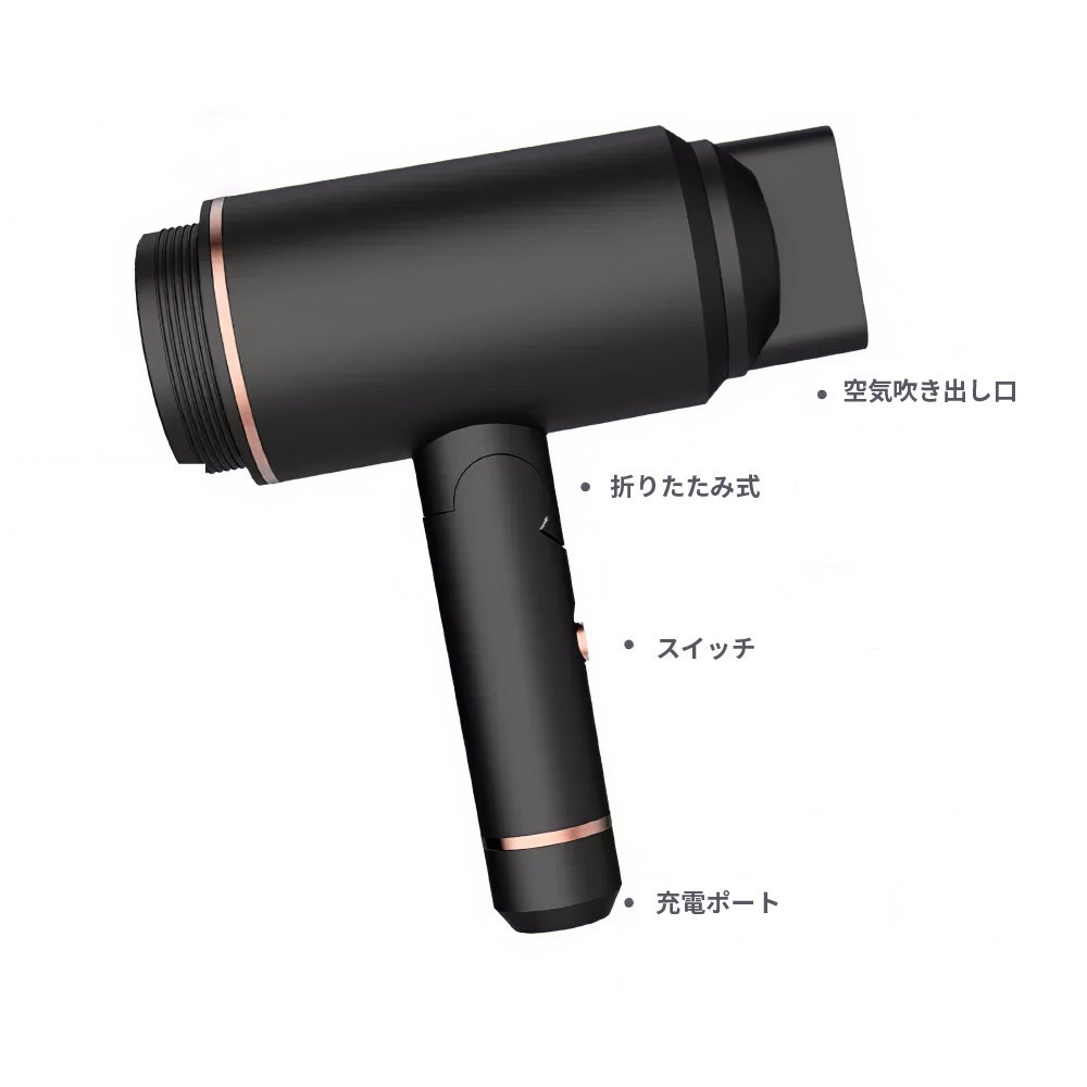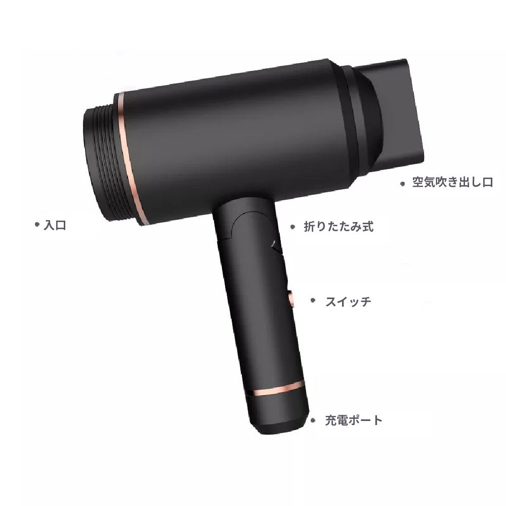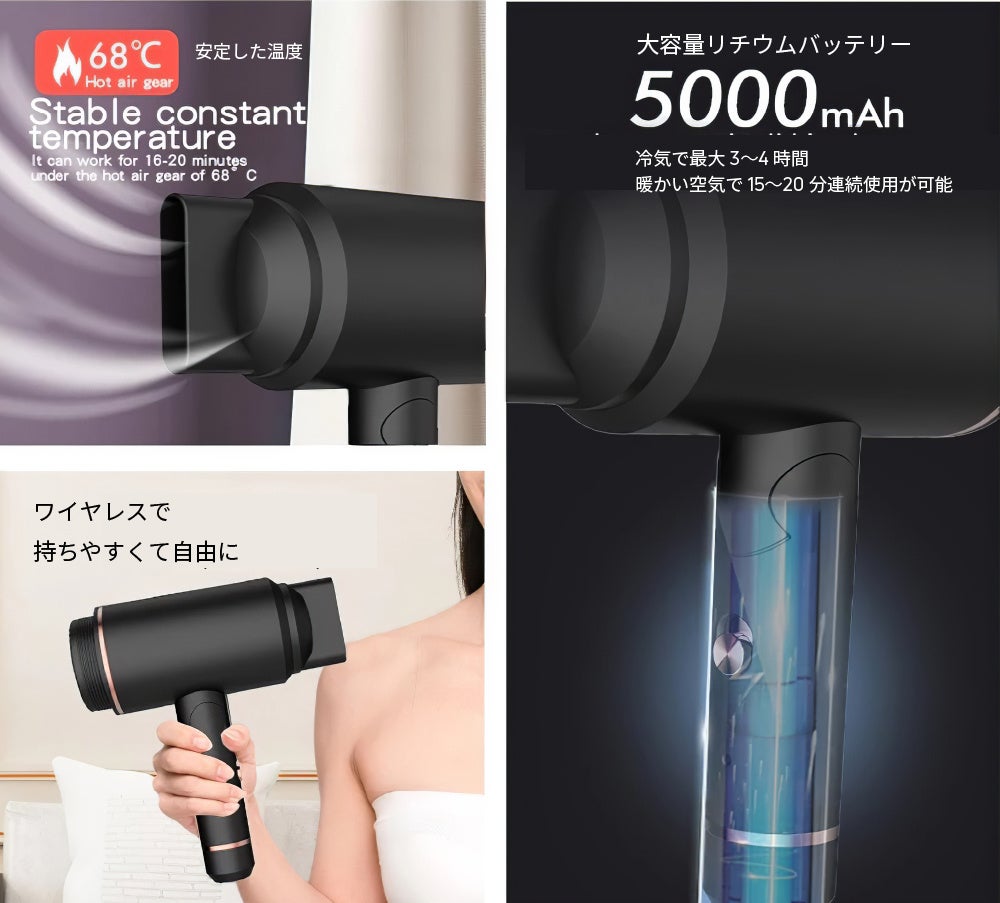 - 大容量5000mAhバッテリー搭載、パワフルで安定して乾かせる