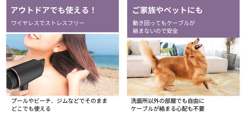 ワイヤレスで髪を乾かせるので、ベッドやリビングなど部屋の好きな場所でゆっくりと乾かしたり、プールサイドやビーチなどのアウトドアな場所でも自由にご利用いただけます。