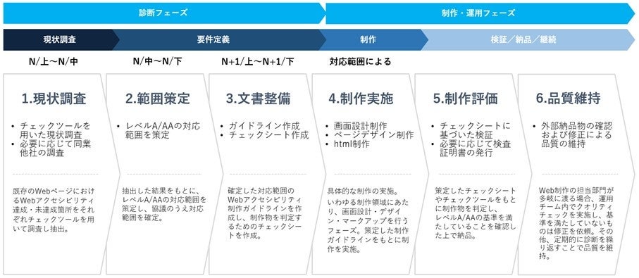 この現状に対応すべくトランスコスモスでは、お客様企業のWebサイトの現状調査から対応範囲を策定し、制作ガイドラインなどのドキュメント作成を行う「診断フェーズ」と、実際のWebサイト改修から改修後の評価、Webアクセシビリティの品質維持までを行う「制作・運用フェーズ」で構成された「Webアクセシビリティ診断改修サービス」を提供し、お客様企業の課題解決を全面的に支援していきます。