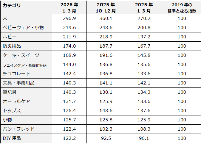 一方で、カカオ豆の世界的な価格高騰とバレンタイン需要が重なった「チョコレート」や、小麦価格等の影響を受ける「パン・ブレッド」、さらには春の需要期に向けた「DIY用品」などで力強い上昇が見られ、インフレの波及先が変化している様子が浮き彫りとなっています。