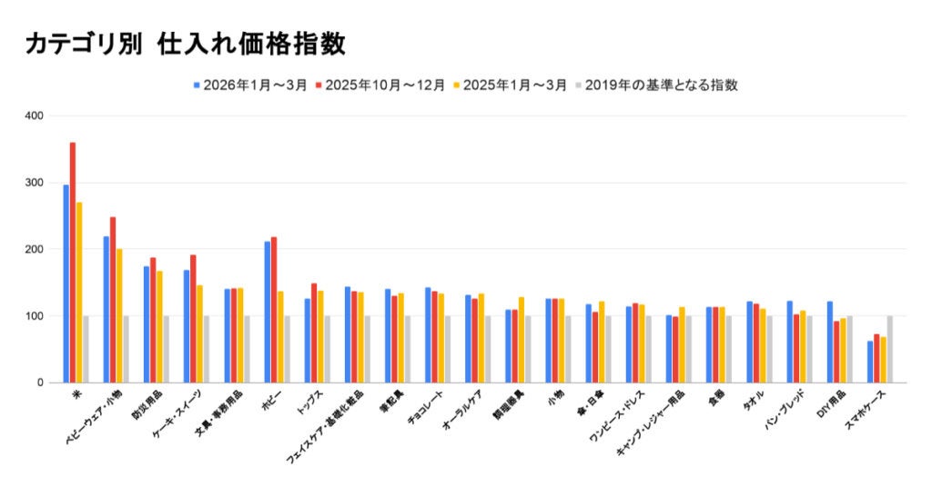 本レポートは、卸・仕入れサイト「スーパーデリバリー」における商品の仕入れ単価(1個あたり)の動向を、2019年を基準(=100)とした価格指数として分析したものです。2026年1月~3月のデータに基づき、主要ジャンルごとの価格変動を前期(2025年10月~12月)と比較しながら解説します。