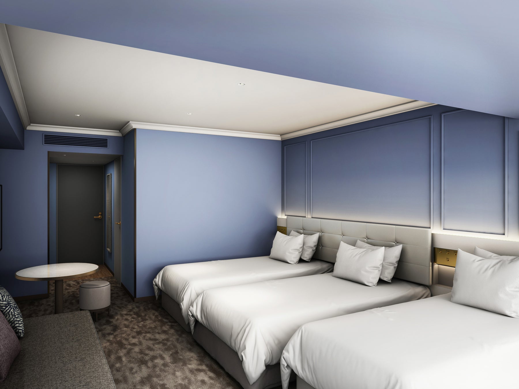 今回リニューアルする客室は、ヨーロッパでも人気のビーチリゾートである南仏・ニースの空や海の青をイメージした上質で爽やかなブルーを基調とし、金色に輝くサンセットのような調度品を取り入れ、海を意味する「Marin(マラン) Floor」としてリゾートステイにふさわしい空間へと仕上げています。