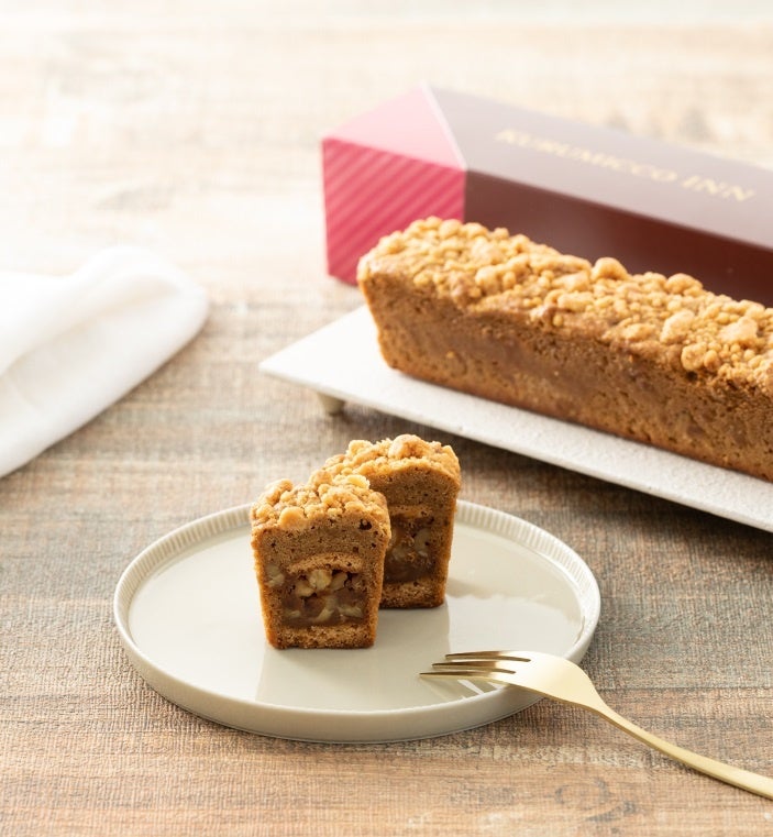 リスくんたちが一息つくお宿(INN)をイメージし、コーヒーのパウンドケーキでクルミッ子を丸ごと包み込みました。表面にはレモン風味のクランブルとアクセントにあられをトッピング。相性良く重なり合うクルミッ子とコーヒーの味と香りを、パウンドケーキの食感とともにお楽しみください。