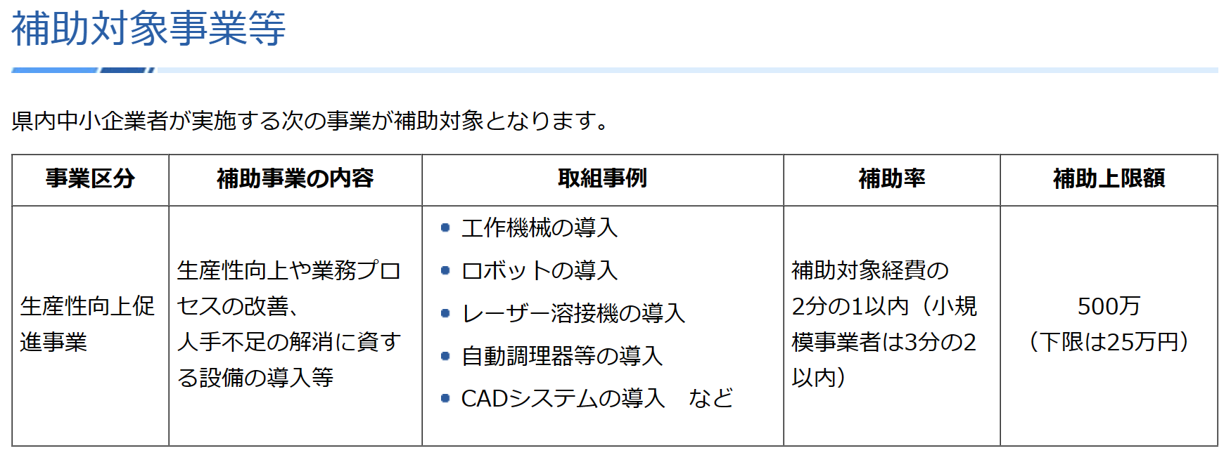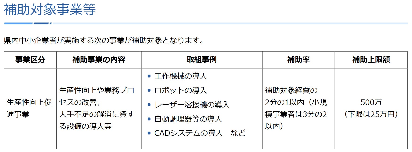 神奈川県内に事業所を有する中小企業で、かつ補助の対象となる事業を神奈川県内の事業所で実施する事業者向けの補助金であり、生産性向上に資する設備導入等に対し補助する制度となっている。
