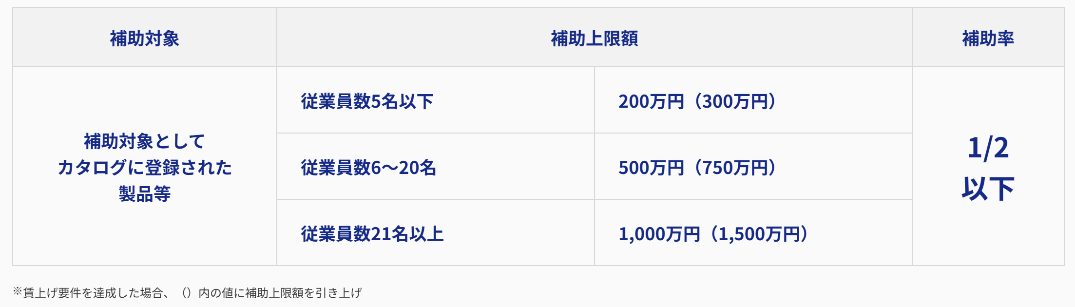 カタログに掲載された製品が補助対象。また、補助上限額は従業員数ごとに異なる。